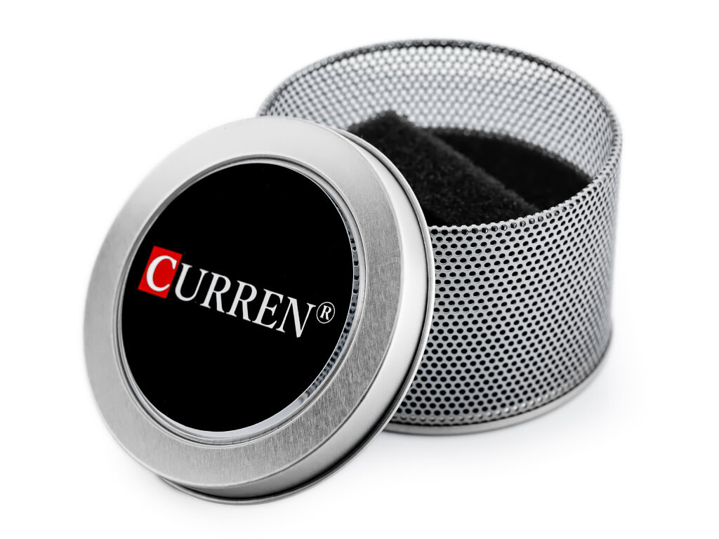 Metal box lined with sponge. CURREN brand logo on the lid.