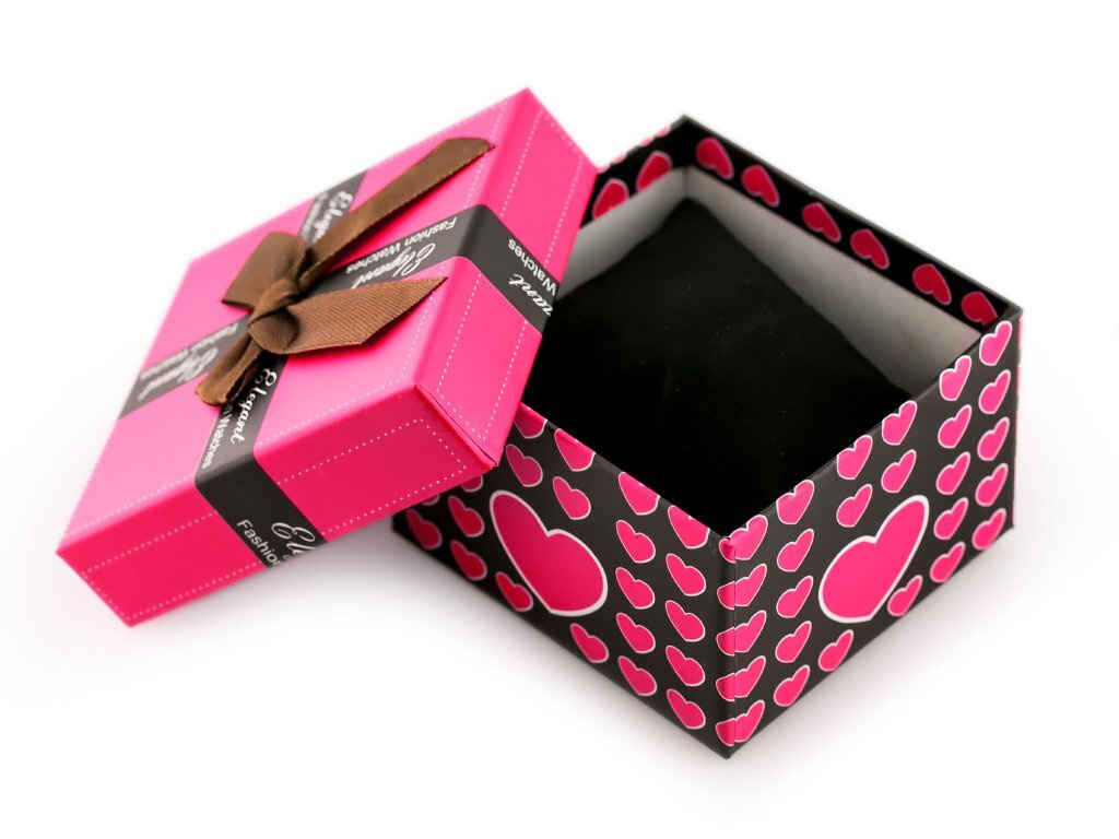 Cardboard heart box in dark pink and black color with brown ribbon.