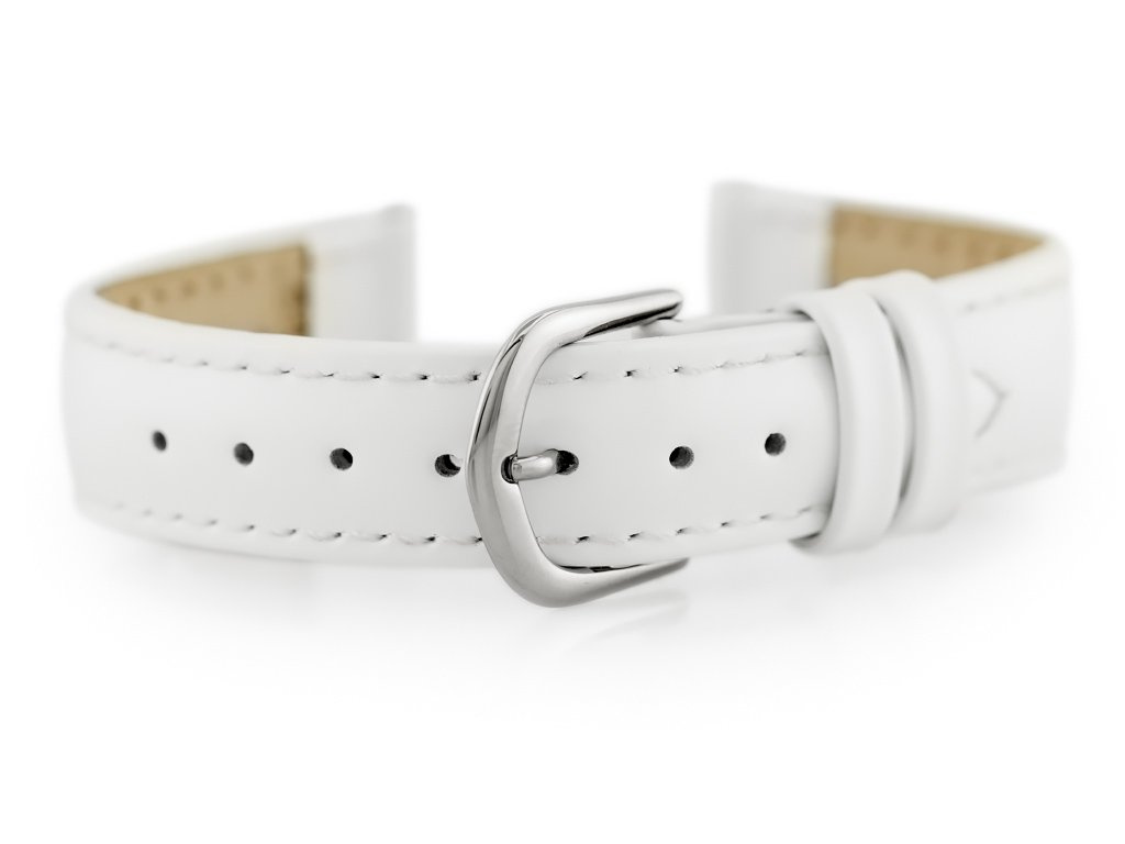 Lakierowany pasek ze skóry naturalnej w kolorze białym z białymi przeszyciami. Klamerka ze stali szlachetnej w kolorze srebrnym.