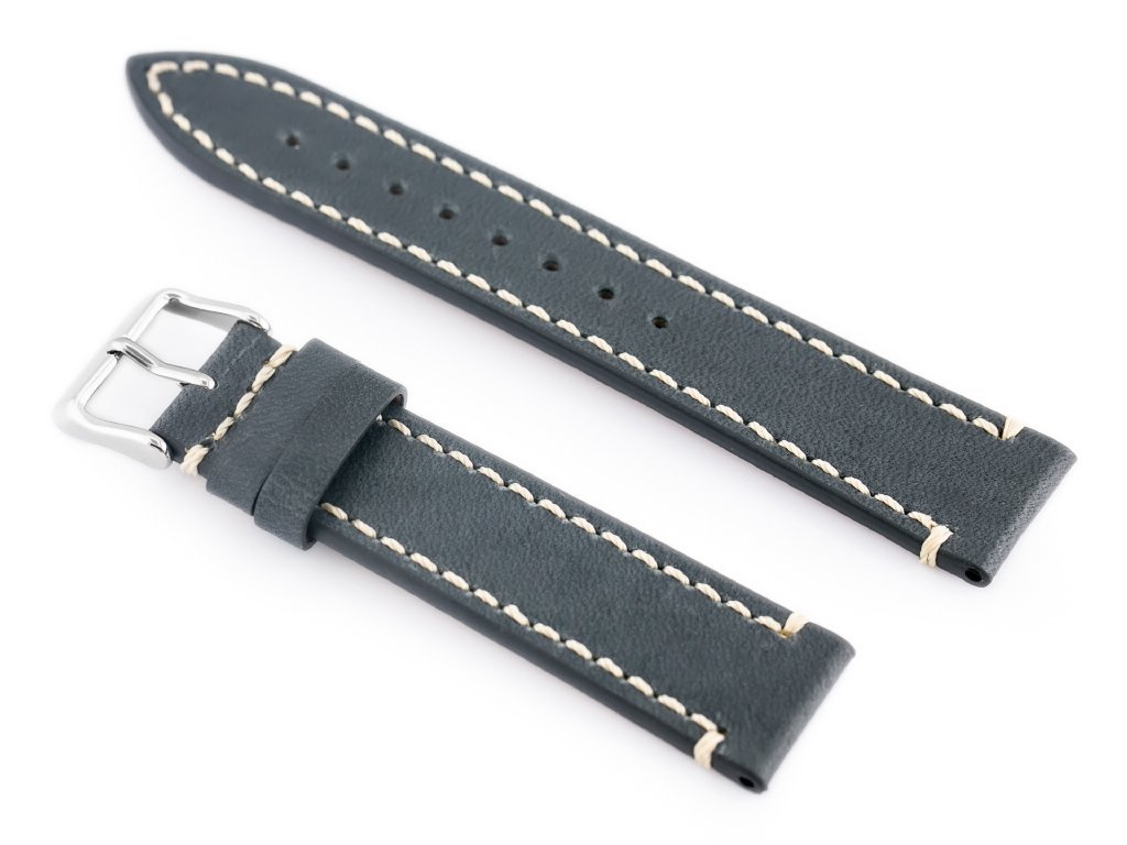 Natural leather belt in gray-blue color with beige stitching. Stainless steel buckle in silver color.