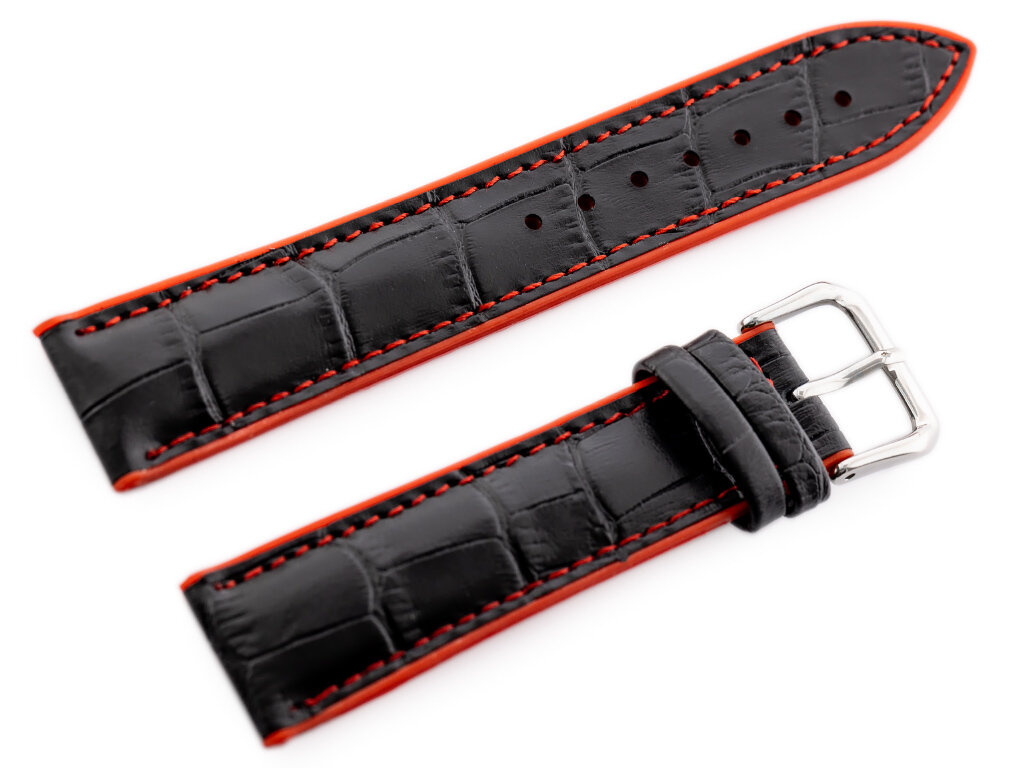 Red-black rubber strap with leather top, stitched with red thread.