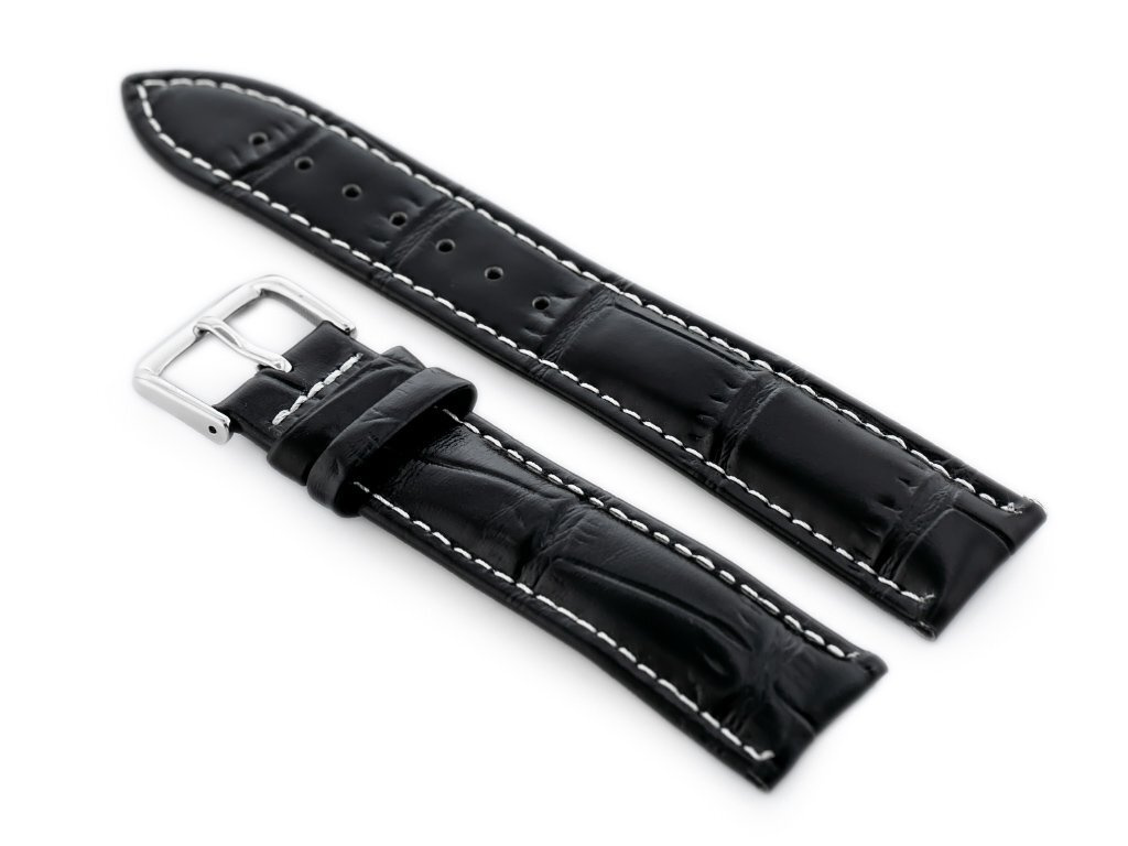 Natural leather belt in black with white stitching. Silver-colored metal buckle.