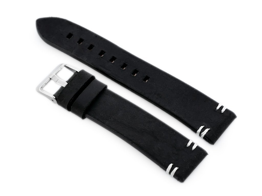 Natural leather belt in black with white threads. Silver-colored metal buckle.