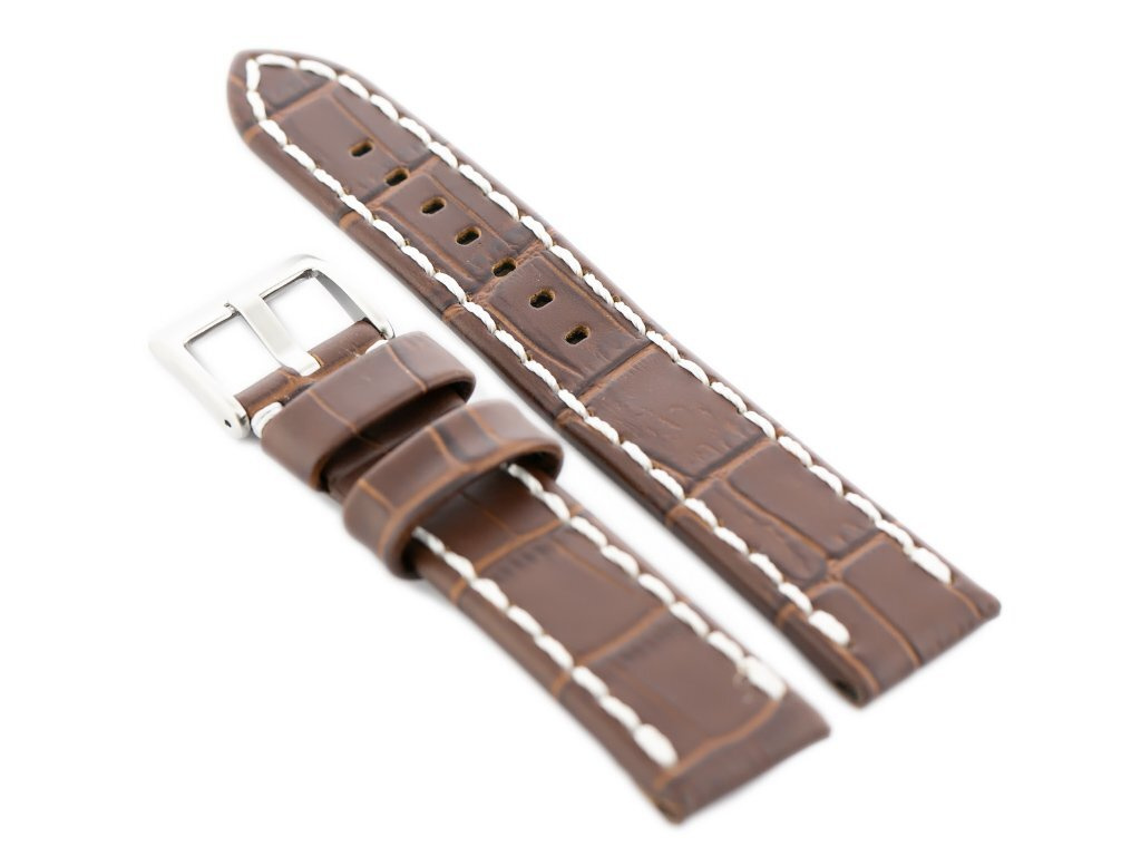 Natural leather belt in dark brown color with white stitching. Silver-colored metal buckle