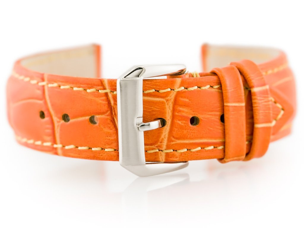 Natural leather belt in orange color with orange stitching. Silver-colored metal buckle.
