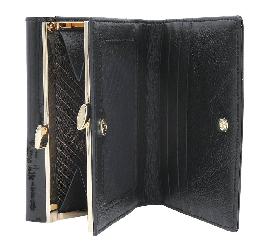 • Horizontal women's wallet protected by a flap with a snap closure. Made of high quality patent leather. Equipped with multiple card tabs, space for a registration card and a pocket for banknotes. Model with an external purse with a bigot.