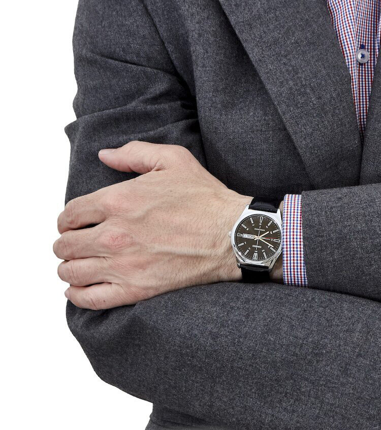 The watch is equipped with a steel envelope, the shiny surface of which perfectly contrasts with the dial. Such a choice of materials guarantees not only an attractive appearance, but also durability and resistance to everyday wear. Wearing comfort is ensured by a black leather strap, which blends perfectly with the overall design, adding a touch of classic to the watch.