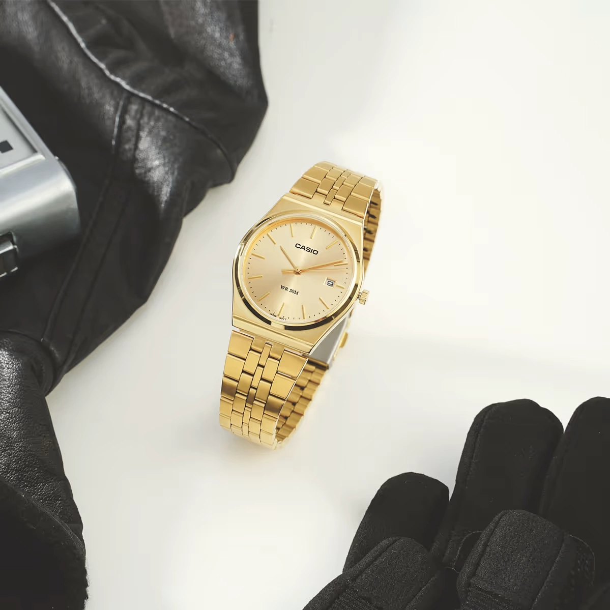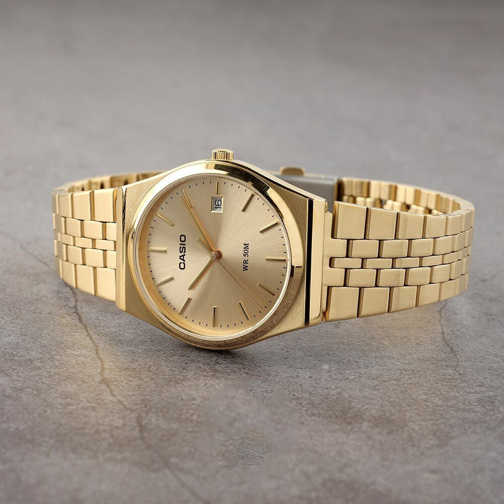 CASIO MTP-B145G-9A is a timepiece that combines ruggedness and sophisticated style. With a water resistance of up to 50M, you can confidently wear it every day without worrying about splashes or brief contact with water - whether you're at the office, in a meeting or on a weekend getaway. The gold stainless steel bracelet perfectly harmonizes with the envelope, creating a coherent and harmonious whole, which attracts attention with its elegance and simplicity. It not only adds a noble touch to the watch, but also guarantees comfortable wearing for long hours, thanks to a precisely designed clasp that fits perfectly on the wrist.