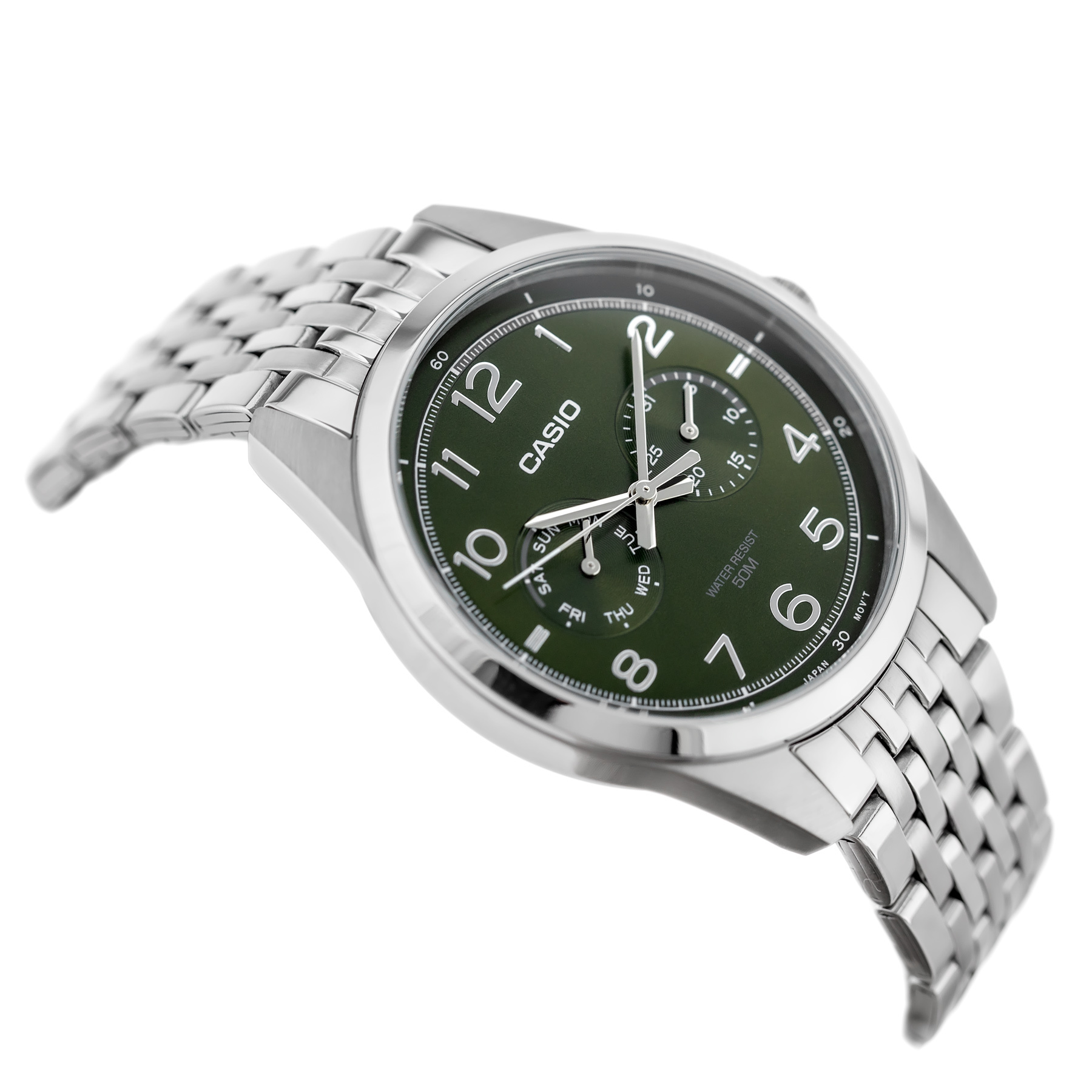 The CASIO MTP-E340D-3A men's watch is a harmonious combination of classic elegance and modern functionality, making this model an ideal choice for men who appreciate style, reliability and versatility. Its round steel envelope in a silver tone exudes a timeless design, while looking extremely modern thanks to its subtle details. The watch's dial, which is kept in a subdued green color scheme, is decorated with silver indexes and slender hands that ensure excellent time legibility. A subtle touch in the form of the date and chronograph functions adds a practical touch to the watch, making it not only stylish, but also a functional accessory that will always remind you of important dates.