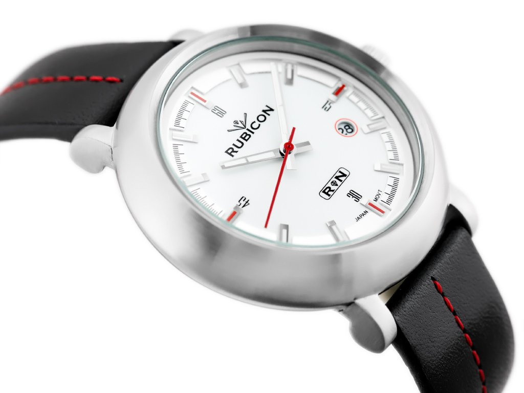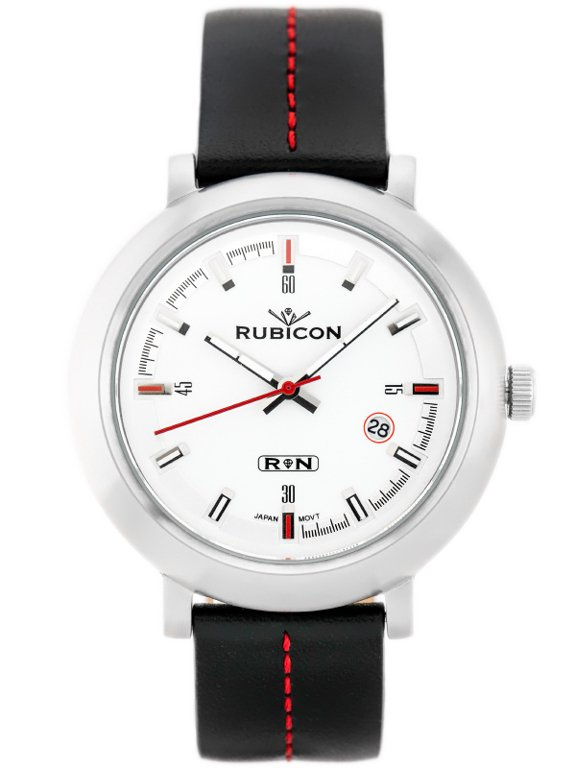 Color scheme: Silver dial, silver-colored envelope, black strap, red stitching and second hand