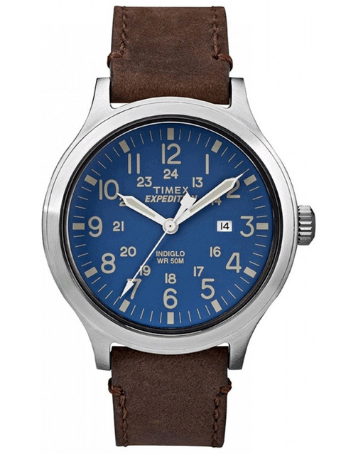The Timex Expedition TW4B06400 watch is a timepiece ideal for a man who likes versatile accessories, matching both sporty attire and casual wear. It features an original brown leather strap. The silver envelope is made of high-quality stainless steel. The dial of the watch is blue, and the hands, numerals and indexes placed on it have a color similar to the body of the timepiece. This combination makes the watch exceptionally legible. In addition, the indices on the dial are fluorescent, so even in low light the time will be visible. The watch is also equipped with Timex's characteristic Indiglo backlight, activated when the crown is pressed. The Expedition TW4B06400 is equipped with a day of the month date, located at 3 o'clock, as well as original additional indexes, making it easier to read the time in 24-hour mode. The mechanism is covered by mineral glass, resistant to scratches and breakage. The TW4B06400 watch operates on the basis of an incredibly precise quartz movement, powered by a battery. Water resistance has been set at 50 meters, which means that no water will get inside the timepiece in case of splashes.