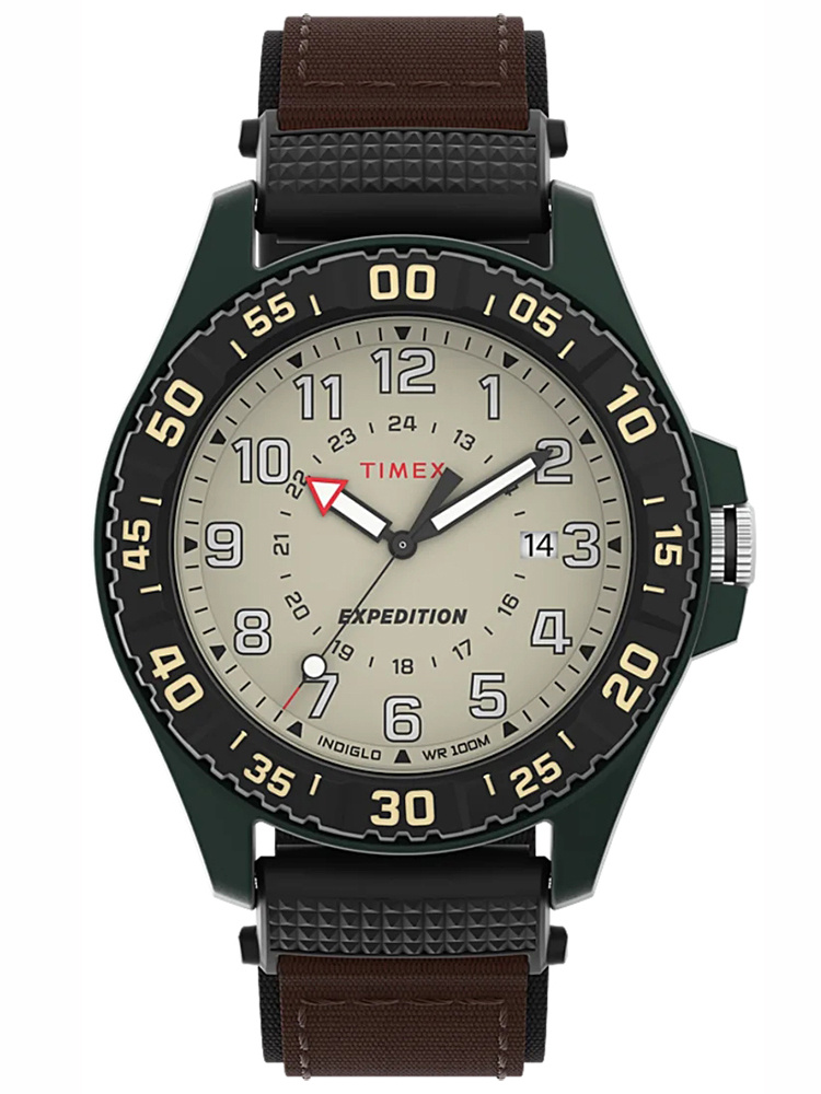 The men's TIMEX Expedition Acadia Rugged TW4B26500 watch fits perfectly with everyday styles. The beige and easy-to-read dial features a date display. This model features a brown fabric strap and a green envelope made of high-quality stainless steel. The water resistance class of the watch is WR100. INDIGLO dial backlight - A special patent for illuminating the dial. When the crown or function button is pressed, the dial of the watch will be illuminated from underneath.