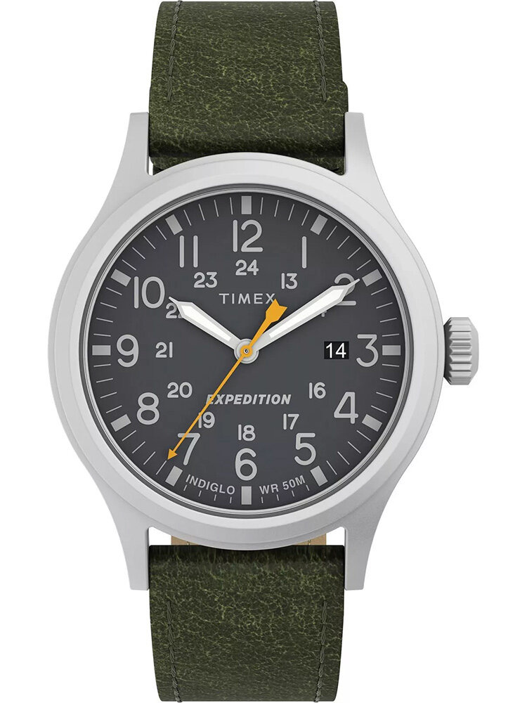 The men's TIMEX Expedition Scout TW4B22900 watch fits perfectly for everyday styling, as well as for more formal occasions. The black and legible dial features a date display. This model features a green leather strap and a silver-colored envelope made of high-quality stainless steel. The water resistance class of the watch is WR50. INDIGLO dial backlight - A special patent for illuminating the dial. When the crown or function button is pressed, the dial of the watch will be illuminated from underneath.
