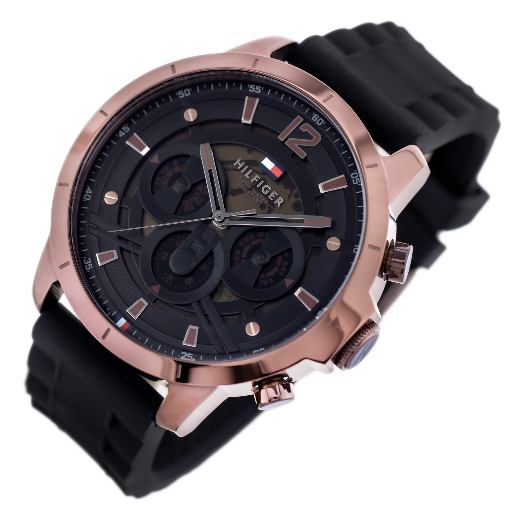 Tommy Hilfiger LUCA 1710491 men's watch is a fashionable casual style model that goes with many looks. The brown-colored envelope made of strong stainless steel is corrosion-resistant, the mineral glass on the dial is highly resistant to shattering and scratching, and the black-colored bracelet is made of silicone. The dial is equipped with functional sub-dials for 24-hour time, day of the week date and day of the month date. The water resistance of the watch is at 5 ATM, you can safely bathe with it.