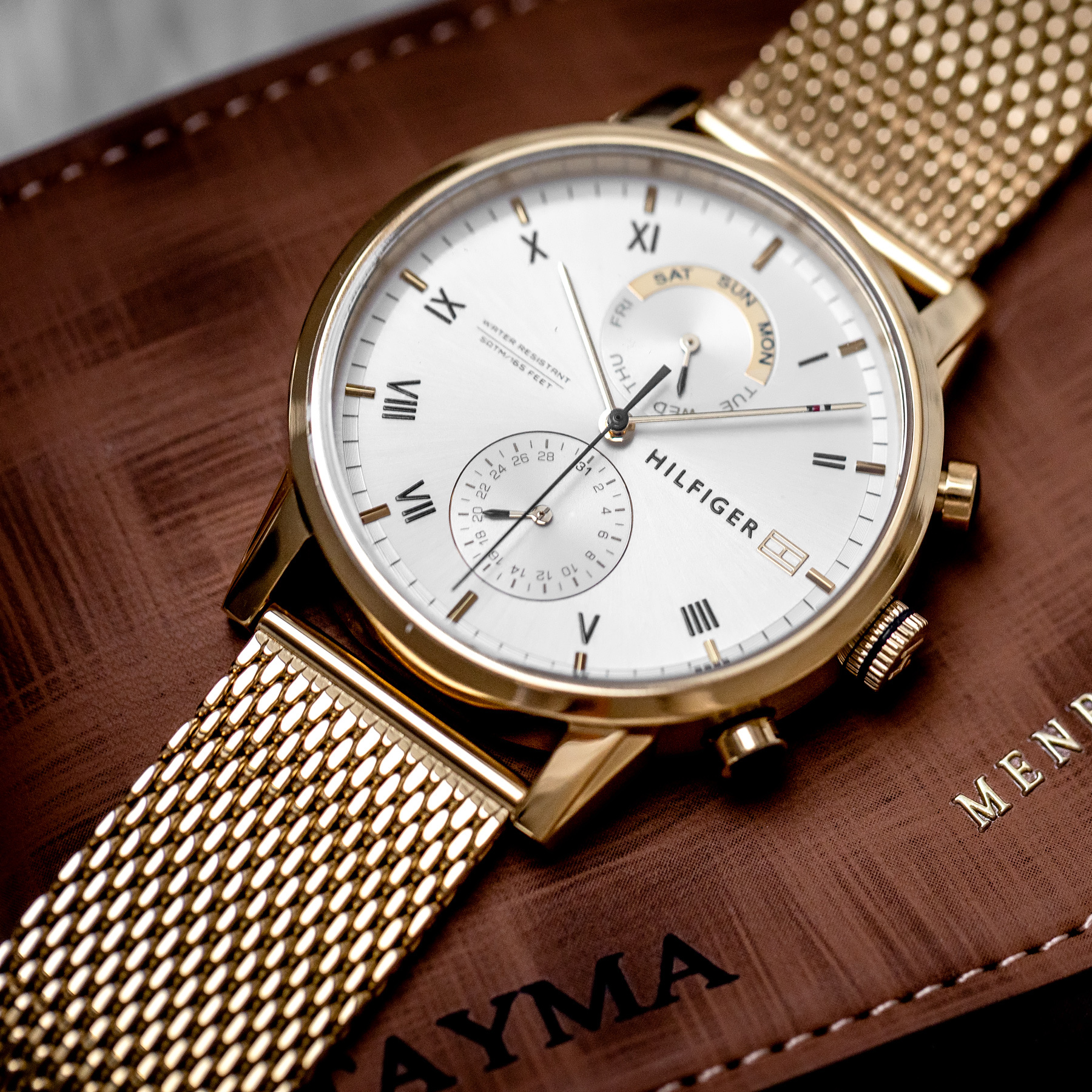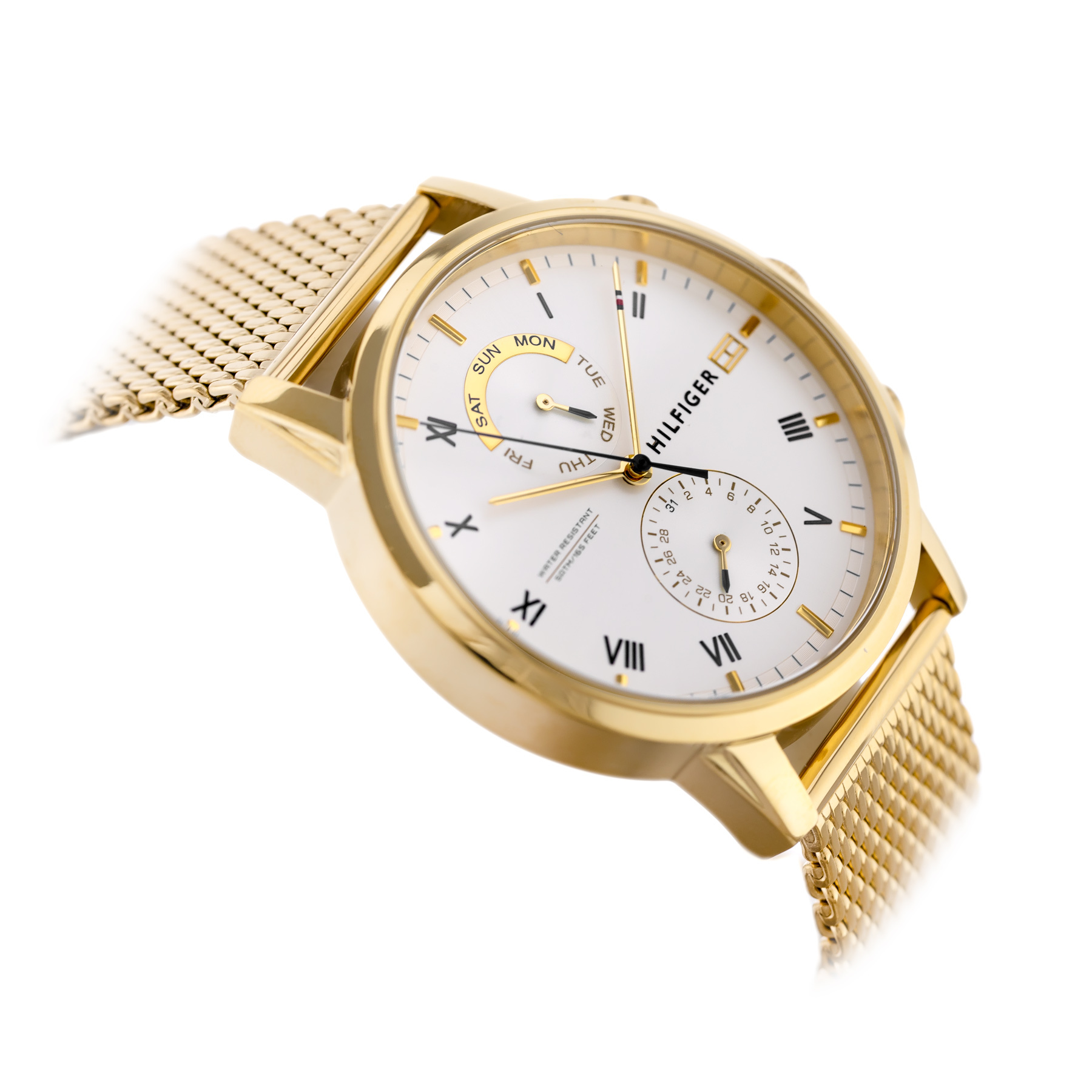 The Tommy Hilfiger 1710403 men's watch will be an elegant addition to a variety of looks. Tommy Hilfiger's white-colored dial features two sub dials with a date function. The steel mesh bracelet in gold color, makes the Tommy Hilfiger watch characterized by delicate styling.