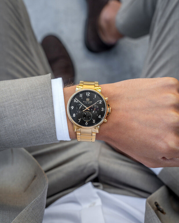 TOMMY HILFIGER 1791978 men's watch with quartz movement. Envelope and bracelet made of gold-plated stainless steel. . Navy blue dial is protected by mineral glass. The diameter of the envelope is 45mm. Thanks to the three sub-dials with daily date and date function, we won't have to worry about forgetting appointments or important dates.
