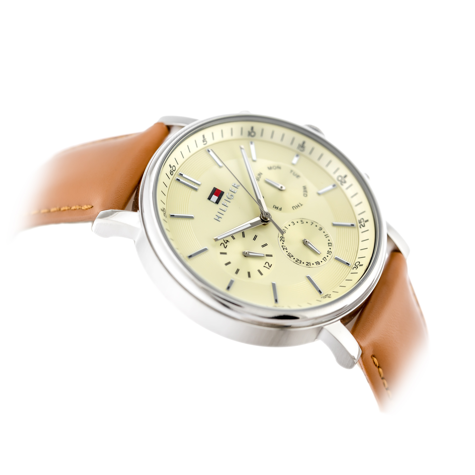 TOMMY HILFIGER TYSON 1792143 men's watch is a unique combination of bronze and silver. The envelope is made of high-grade 316L stainless steel in silver color, corrosion-resistant and hypoallergenic. The brown-colored watch strap is made of natural leather. The beige dial, with a sunray cut, features sub-dials indicating: day of the month, day of the week and 24-hour time. The whole thing is protected by mineral glass. Responsible for timekeeping in the Tommy Hilfiger 1792143 watch is a quartz movement, for which the energy that powers it comes from a battery. The 1792143 model has a water resistance of 5ATM, which makes it slightly resistant to water. The whole thing has been refined to the smallest detail and designed in accordance with current fashion trends, getting a classic, but very elegant watch.