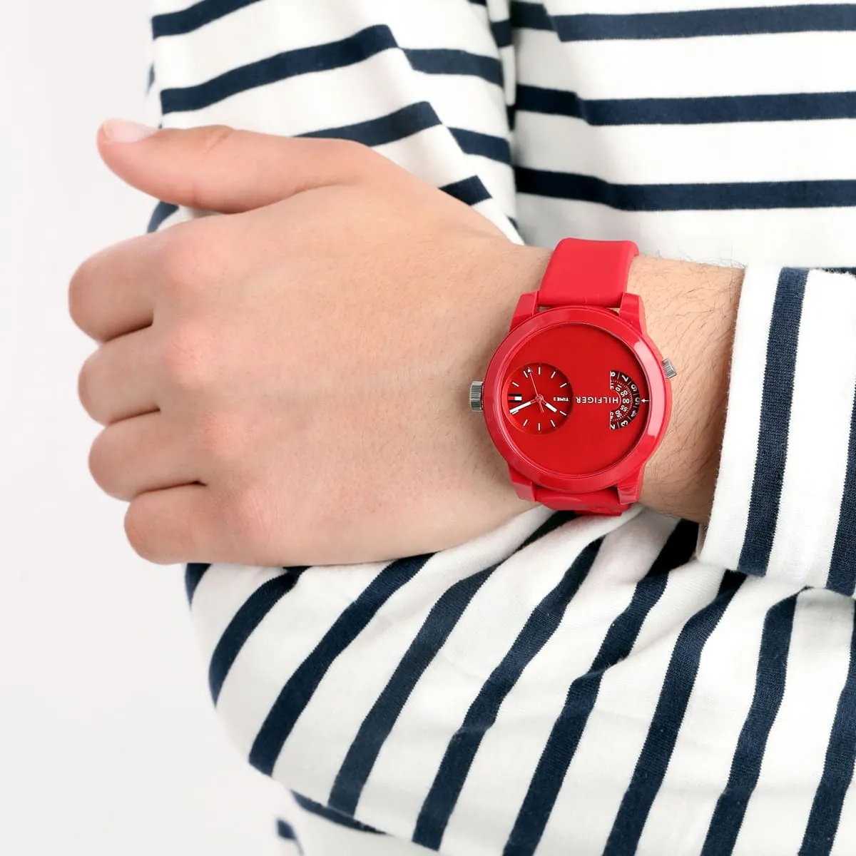Tommy Hilfiger 1791557 to świeży, sportowy czasomierz wyróżniający się intensywnym, czerwonym designem — zarówno tarcza, jak i pasek wykonane z silikonu tworzą spójną i energetyczną kompozycję. Koperta o średnicy 44 mm, wykonana z lekkiego tworzywa TR90 (lub plastiku), skrywa mechanizm kwarcowy, a dodatkowy wskaźnik drugiej strefy czasowej dodaje użytkowej wartości i stylu Zegarek wyposażony jest także w datownik, mineralne szkiełko, czerwony silikonowy pasek z logo marki oraz charakterystyczną dla Tommy’ego flagę na godzinie 3 . Zapięcie na klasyczną klamrę (buckle), wodoszczelność na poziomie 3 ATM (około 30 m), grubość koperty około 10–15 mm – to kolejne cechy tego modelu. To zegarek dla mężczyzn, którzy cenią dynamiczne wzornictwo, wygodę i subtelne detale nawiązujące do dziedzictwa amerykańskiej marki.