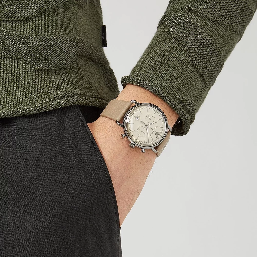 Emporio Armani AR11107 to zegarek męski, który łączy w sobie elegancję z nutą sportowego stylu — typowy „fashion watch”. Należy do linii Aviator, co oznacza, że projekt inspirowany jest zegarkami lotniczymi: czytelność, funkcje pomocnicze i wyrazisty wygląd odgrywają tu dużą rolę.
