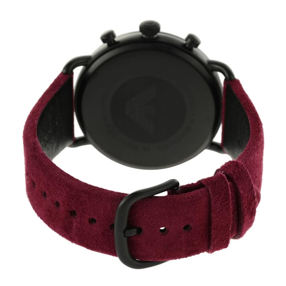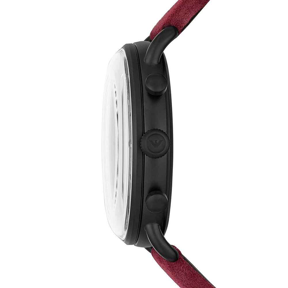 The Emporio Armani AR112265 Aviator watch is an unconventional men's timepiece, ideal for both elegant attire and casual wear. The envelope is made of stainless steel with a high-quality coating in black, which guarantees its long-lasting resistance to damage. The burgundy-colored dial protected by mineral glass features a day-of-the-month date, as well as chronograph and daylight saving time indications. The whole is complemented by a leather strap with a fabric finish on the outside in burgundy color.