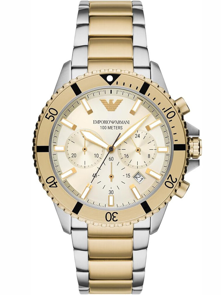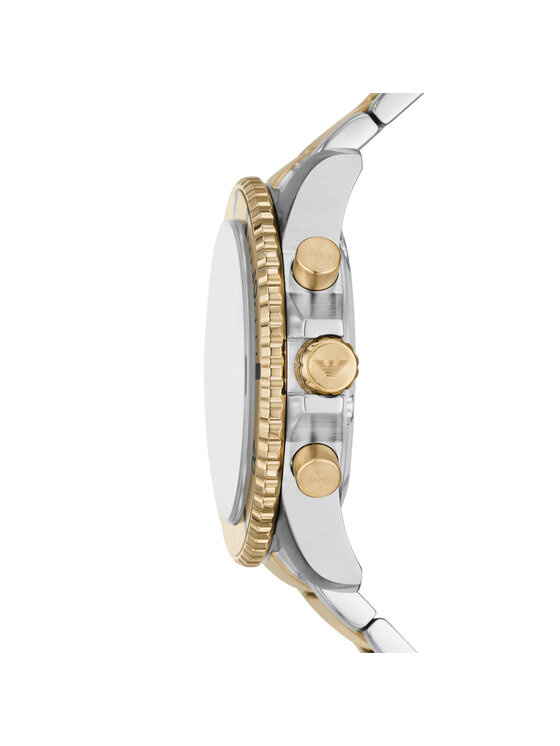 Men's Emporio Armani AR11606 Two-Tone Chronograph is a stylish men's watch, ideal for both elegant attire and casual wear. The bracelet and the envelope are made of stainless steel. The gold dial protected by mineral glass features a date display indicating the day of the month, as well as chronograph and daylight saving time indications. The Emporio Armani AR11606 Two-Tone Chronograph watch will suit every man's taste and will be a perfect gift for any occasion. The water resistance class of the timepiece is WR100, which guarantees that the watch is waterproof, for example, when swimming.