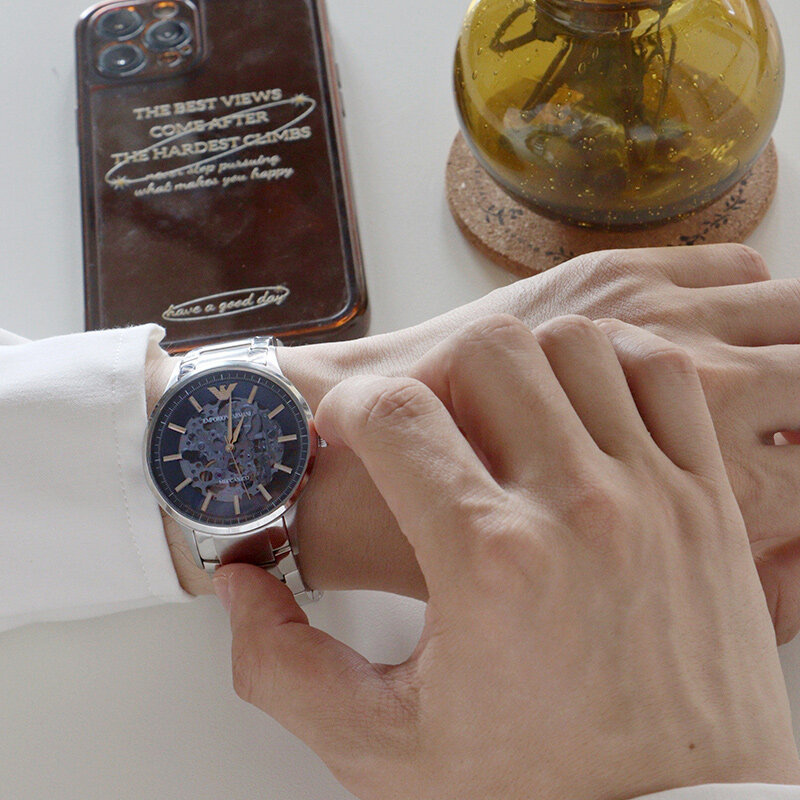 The Emporio Armani men's watch is an example of an elegant automatic watch. It self-winds, using the kinetic energy created by the movements of the hand. The skeleton dial allows us to observe the workings of the mechanism. The Emporio Armani watch will be a perfect addition to a man's closet.