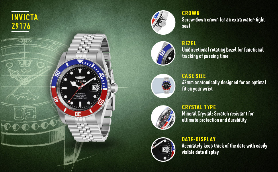 INVICTA 29176 is a classic diver with water resistance up to 200m, with SEIKO NH35A automatic movement.