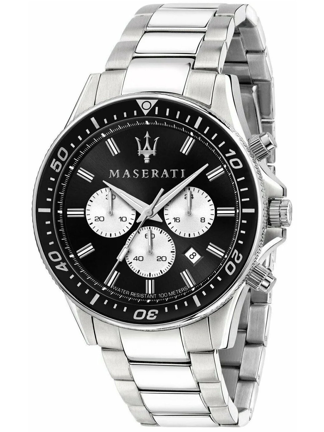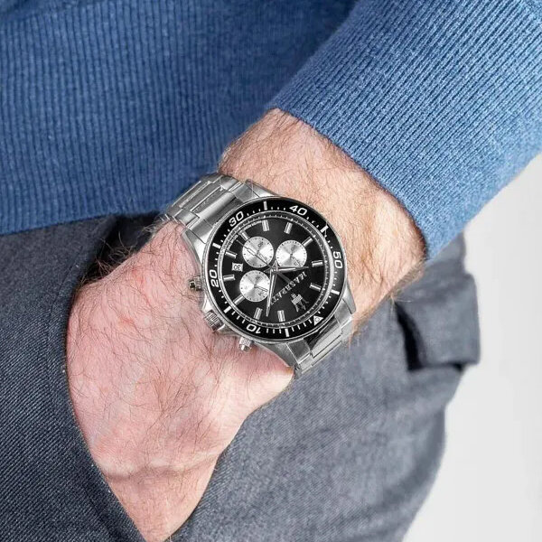 The Maserati Sfida R8873640004 watch is an elegant timepiece for automotive fans and more. On the black dial protected by mineral glass and surrounded by a black bezel, you will find a date display indicating the day of the month, as well as sub-dials that are chronograph and daylight saving time indications.