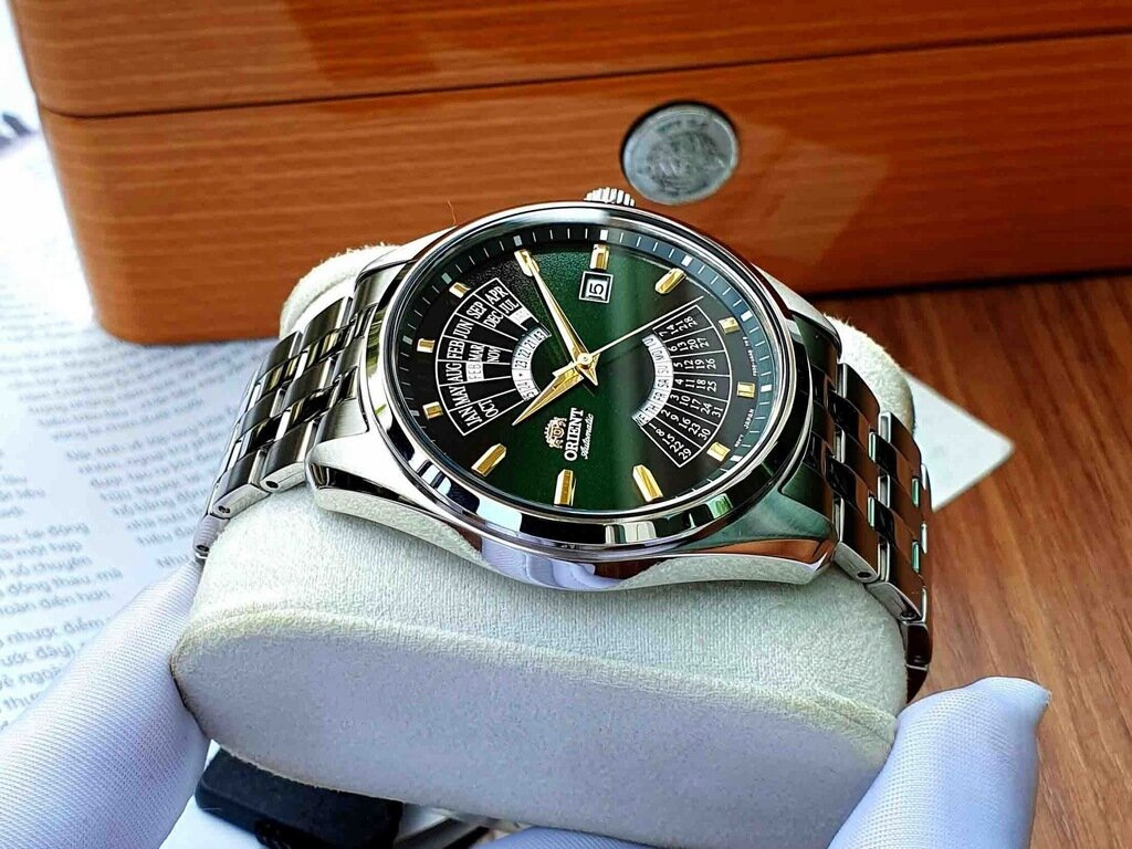 The Orient Automatic RA-BA0002E10B watch from the Multi Year Calendar series is a classic elegant timepiece. The timepiece operates on the basis of an incredibly accurate Japanese automatic-winding mechanism. The green dial, protected by mineral glass, features the brand's signature calendar and day-of-the-month and day-of-the-week date displays.