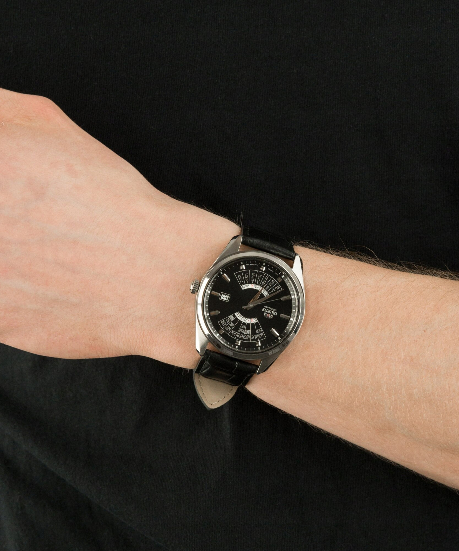 It features a silver-colored envelope made of high-quality stainless steel and a black leather strap. The water resistance class of the timepiece is WR50, which guarantees the watch's watertightness in case of minor splashes. In addition, the model features a screw-down and transparent caseback.