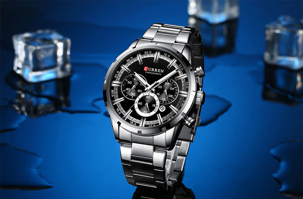 Men's watch CURREN 8355 is an elegant men's watch ideal for both elegant clothing and casual wear. On the black dial with silver finishing, you will find the day of the month date, as well as sub-dials that are chronograph and daylight saving time indications.