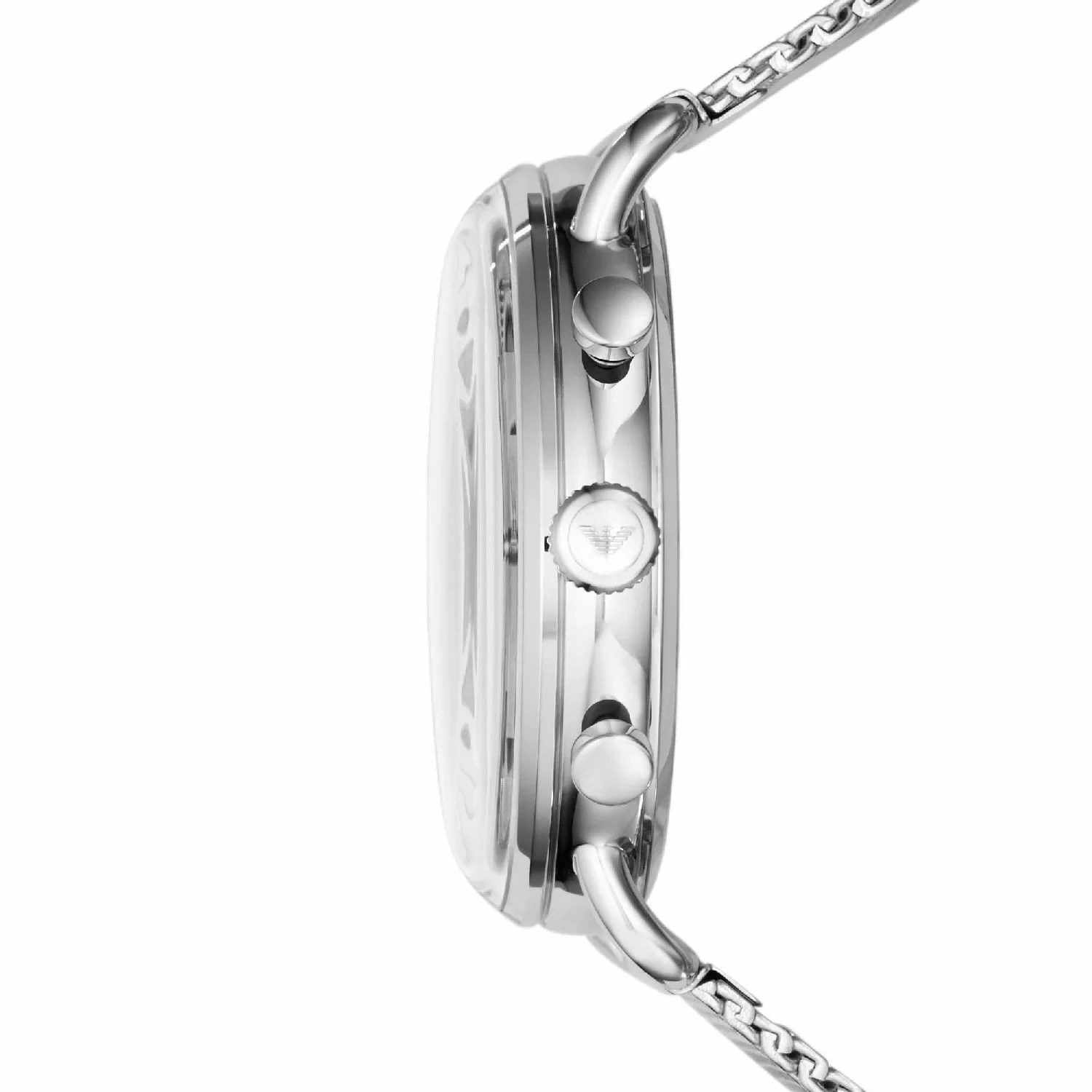 Męski zegarek Emporio Armani AR11104 z serii Aviator to stylowy męski zegarek, idealny zarówno do eleganckiego ubioru, jak i do noszenia na co dzień. Bransoletka typu mesh oraz koperta wykonane zostały ze stali szlachetnej w kolorze srebrnym. Na czarnej tarczy zabezpieczonej mineralnym szkłem znajdziemy datownik wskazujący dzień miesiąca oraz subtarcze będące wskazaniami chronografu oraz czasu dobowego a także subtelne logo marki. Zegarek Emporio Armani AR11104 trafi w gust każdego mężczyzny i będzie idealnym prezentem na każdą okazję.