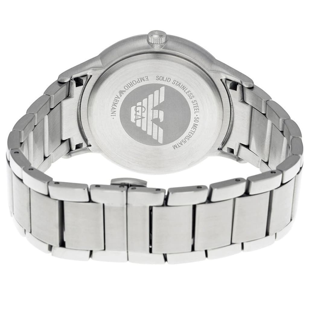 Męski zegarek Emporio Armani Renato AR11182 to klasyczny męski zegarek, idealny zarówno do eleganckiego ubioru, jak i do noszenia na co dzień. Koperta oraz bransoleta zostały wykonana ze stali szlachetnej, co gwarantuje jej wieloletnią odporność na zniszczenie. Na granatowej tarczy zabezpieczonej mineralnym szkłem znajdziemy datownik wskazujący dzień miesiąca.