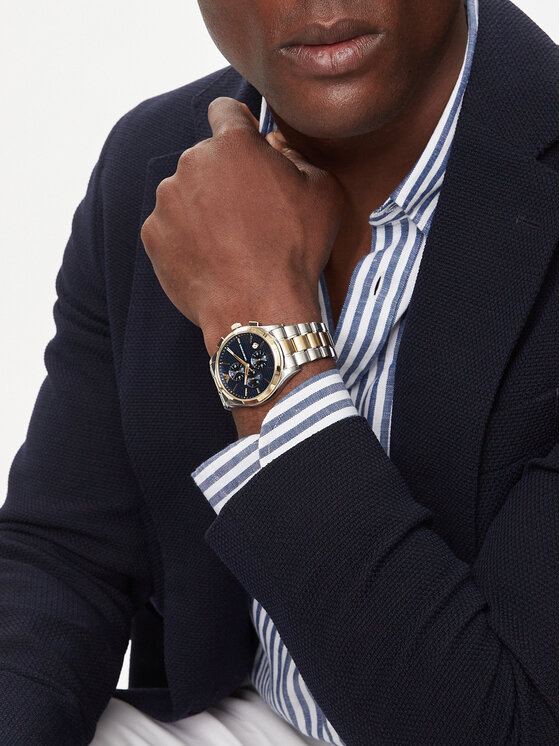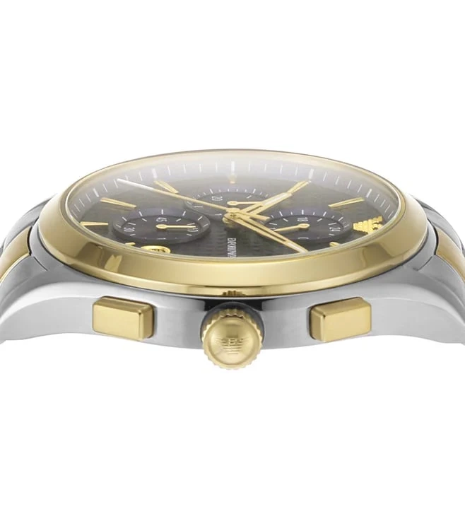 Męski zegarek Emporio Armani AR11579 to stylowy męski zegarek, idealny zarówno do eleganckiego ubioru, jak i do noszenia na co dzień. Bransoletka oraz koperta wykonane zostały ze stali szlachetnej w kolorze srebrnym i złotym. Na niebieskiej tarczy zabezpieczonej mineralnym szkłem znajdziemy datownik wskazujący dzień miesiąca oraz subtarcze będące wskazaniami chronografu oraz czasu dobowego, a także subtelne logo marki. Zegarek Emporio Armani AR11579 trafi w gust każdego mężczyzny i będzie idealnym prezentem na każdą okazję. Klasa wodoszczelności czasomierza to WR50, co gwarantuje szczelność zegarka w przypadku drobnych zachlapań.