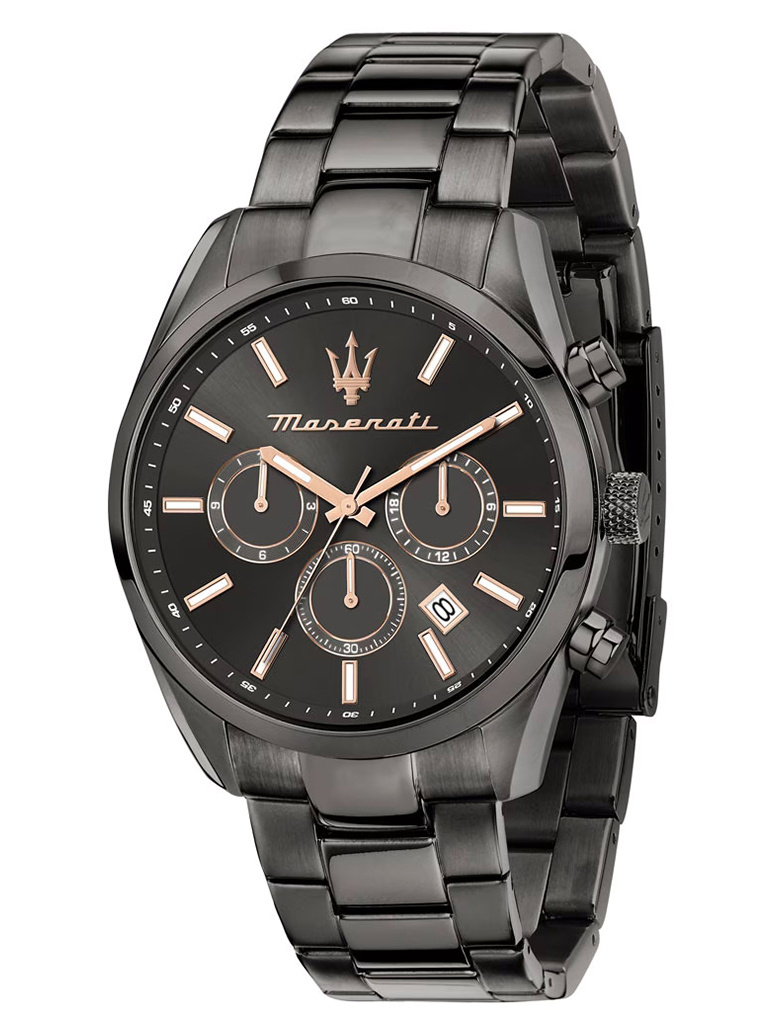 Zegarek Maserati R8853151001 to elegancki i nowoczesny zegarek męski. Na czarnej tarczy z rózowo złotymi indeksami zabezpieczonej mineralnym szkłem znajdziemy datownik wskazujący dzień miesiąca oraz subtarcze będące wskazaniami chronografu i czasu dobowego.