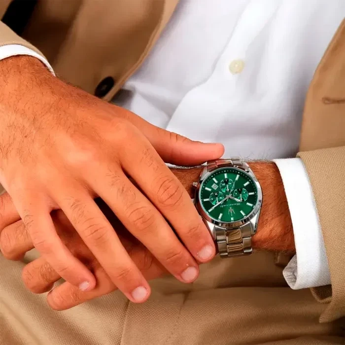 Zegarek Maserati R8853151011 to elegancki i nowoczesny zegarek męski. Na zielonej tarczy ze srebrnymi indeksami zabezpieczonej mineralnym szkłem znajdziemy datownik wskazujący dzień miesiąca oraz subtarcze będące wskazaniami chronografu i czasu dobowego.