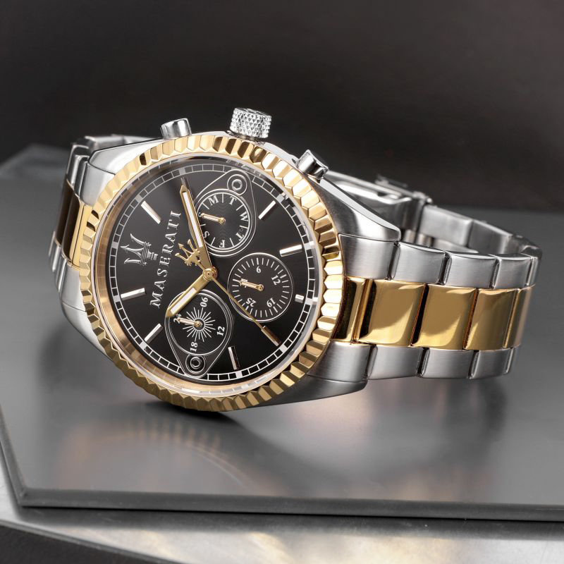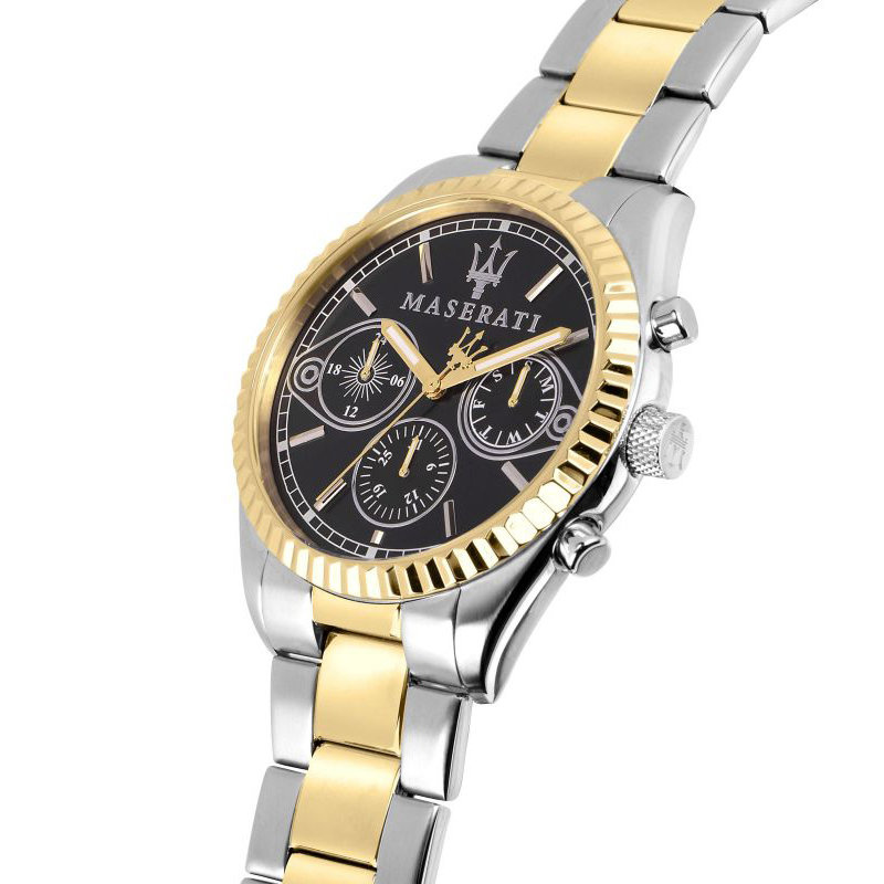 Zegarek Maserati Competizione R8853100016 to elegancki zegarek dla fanów motoryzacji i nie tylko. Na czarnejj tarczy zabezpieczonej mineralnym szkłem znajdziemy subtarcze będące wskazaniami dnia tygodnia, dnia miesiąca i czasu dobowego.