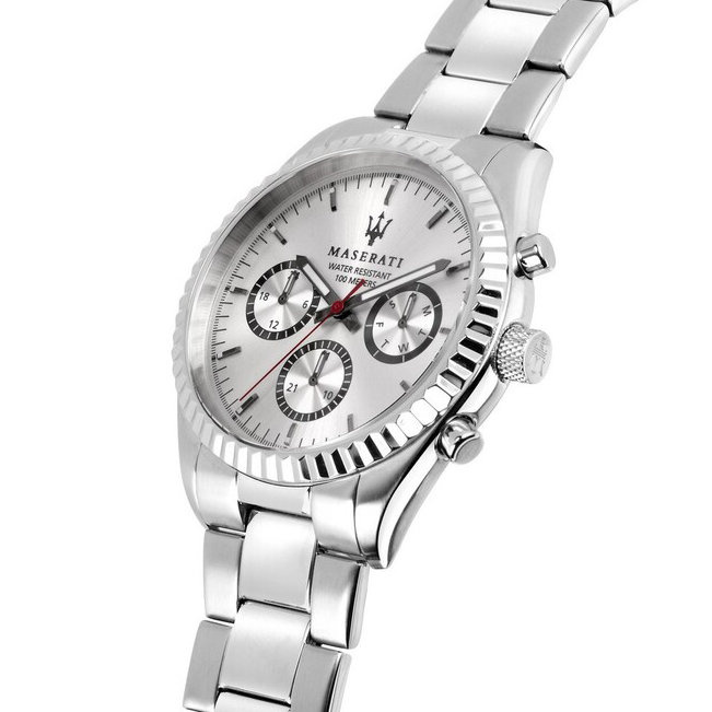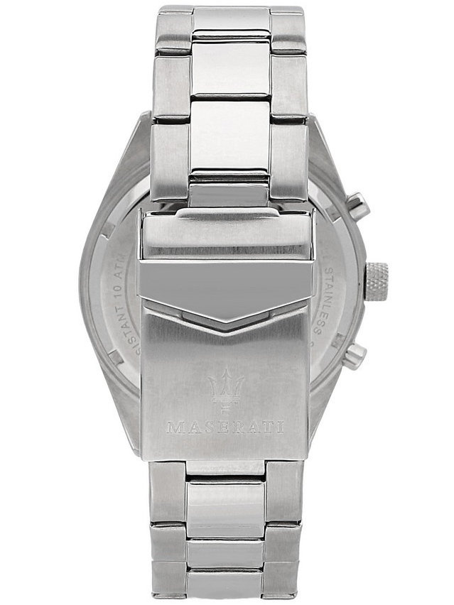 Zegarek Maserati COMPETIZIONE R8853100018 to klasyczny model, który przypadnie do gustu każdemu mężczyźnie. Po zegarki tej marki chętnie sięgają fani włoskiej, luksusowej marki Maserati, jak i osoby poszukujące czasomierza do noszenia na co dzień. Zegarek ten został wykonany w całości ze stali szlachetnej, która jest odporna na korozję. Na srebrnej tarczy zabezpieczonej mineralnym szkłem znajdziemy subtarcze będące wskazaniami dnia tygodnia, dnia miesiąca i czasu dobowego. Za niezawodne działanie urządzenia odpowiada dokładny mechanizm kwarcowy zasilany baterią. Zegarek Maserati COMPETIZIONE R8853100018 posiada klasę wodoszczelności 10 ATM, co oznacza, że jest odporny na kontakt z wodą.