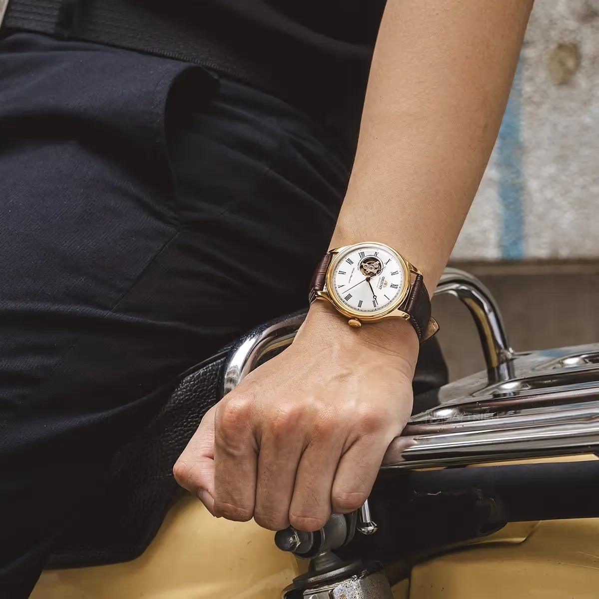 Zegarek ten posiada brązowy skórzany pasek oraz złotą kopertę, wykonaną z wysokiej jakości stali nierdzewnej. Klasa wodoszczelności czasomierza to WR50, co gwarantuje szczelność zegarka w przypadku drobnych zachlapań.