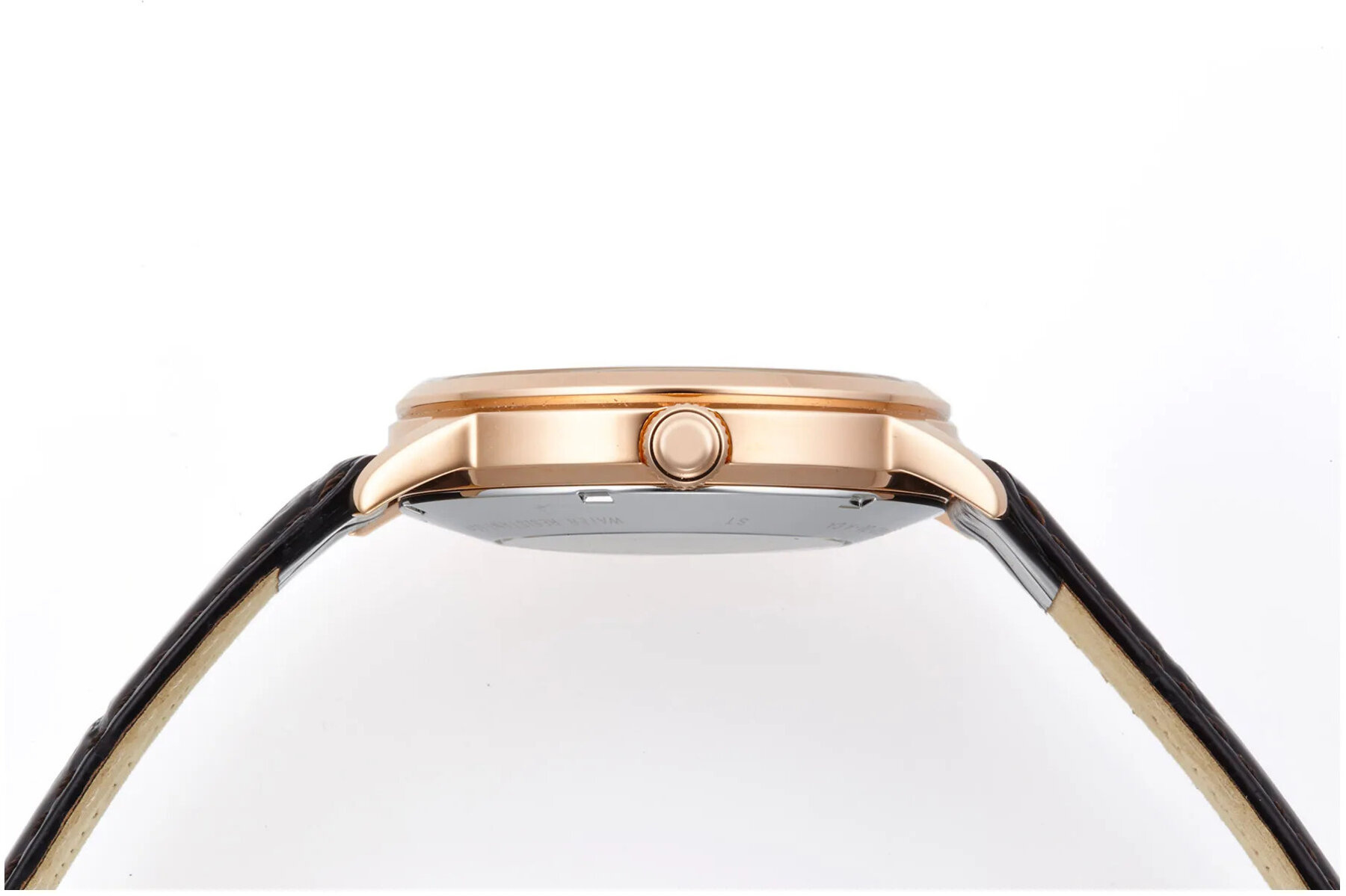 Zegarek ten posiada brązowy skórzany pasek oraz kopertę w kolorze różowego złota, wykonaną z wysokiej jakości stali nierdzewnej. Klasa wodoszczelności czasomierza to WR30