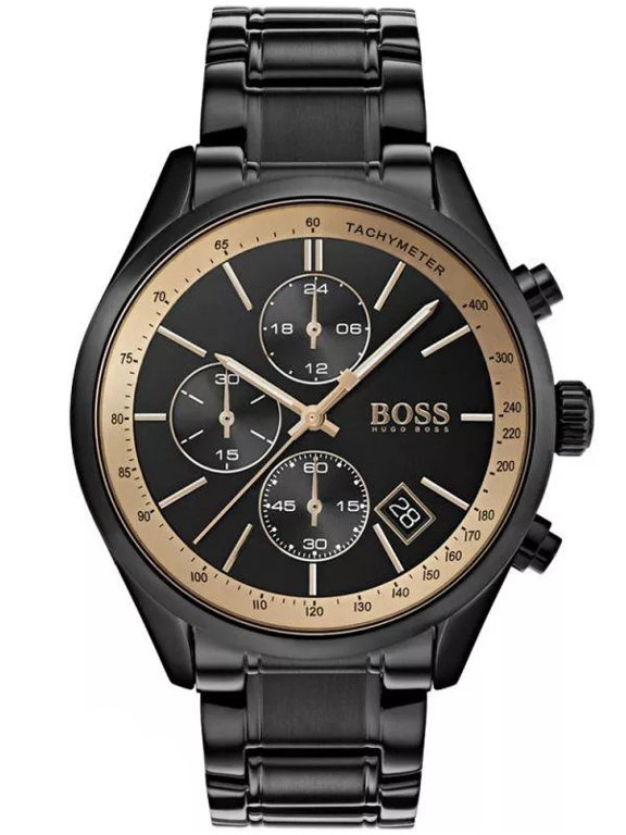 The Hugo Boss 1513578 men's watch from the Grand Prix series is an extremely elegant men's timepiece, ideal for both elegant attire and casual wear. The model of this watch features a black bracelet and an envelope - both made of stainless steel. On the gold and black colored dial protected by mineral glass, we can find a date pad indicating the day of the month, as well as sub-dials that are chronograph and daylight saving time indications.