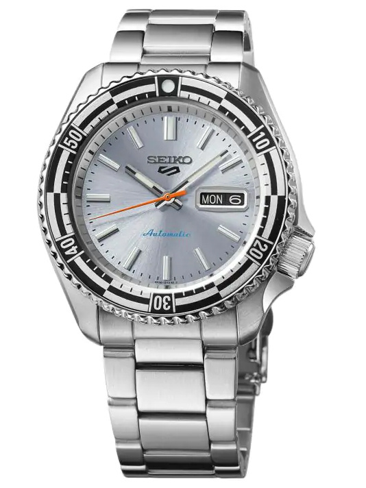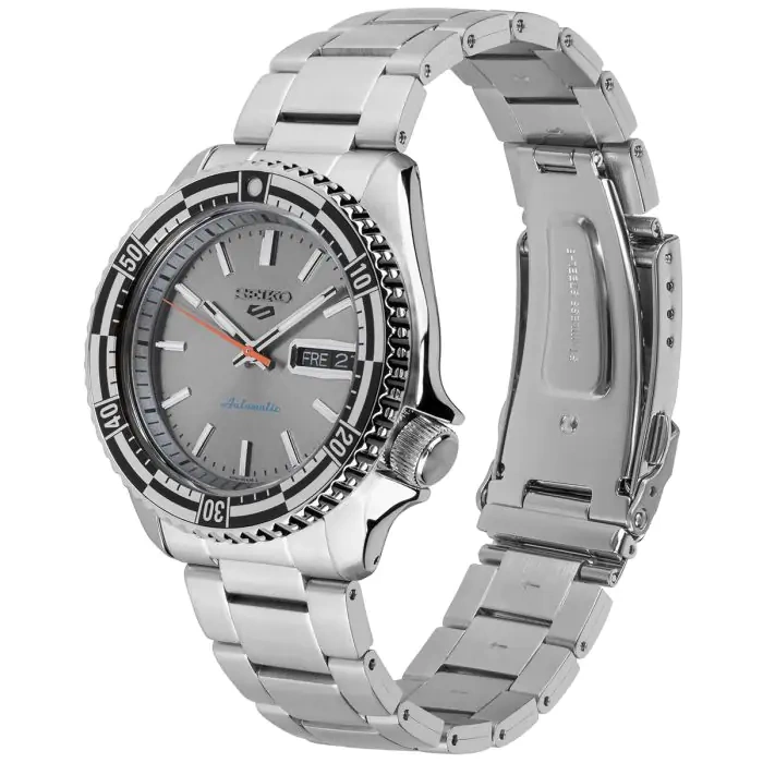Zegarek Męski Seiko 5 Sports Automatic SRPK09K1 to zegarek, który wyróżnia się nie tylko niezawodnością, ale i wyjątkowym designem. Jego solidna koperta ze stali nierdzewnej w połączeniu z elegancką stalową bransoletą w srebrnym odcieniu tworzą klasyczną, a zarazem nowoczesną całość. Centralnym punktem zegarka jest jego , srebrny cyferblat, który z pewnością przyciąga wzrok. Zabezpiecza go mineralne szkło o wzmocnionej twardości. Model wyposażono w funkcje datownika, który wyświetla zarówno dzień tygodnia, jak i miesiąca, obrotowy bezel oraz transparentny, zakręcany dekiel, który pozwala podziwiać mechanizm od środka. Dodatkowo, podświetlenie LumiBrite zapewnia doskonałą widoczność w ciemności. W sercu zegarka znajduje się japoński mechanizm automatyczny Seiko 4R36, który oferuje precyzję chodu w zakresie od +45 do -35 sekund dziennie i umożliwia ręczne nakręcanie. Zegarki z najnowszej serii Seiko 5 Sports wyróżniają się jeszcze większą dokładnością niż ich poprzednicy. Zegarek oferuje również wodoodporność do 100 metrów, co sprawia, że jest odpowiedni do pływania i nurkowania na mniejszych głębokościach. To model, który doskonale łączy funkcjonalność z charakterystycznym stylem.