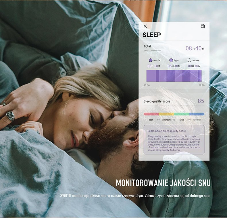 Monitor snu pozwala na kontrolę jakości naszego snu, do czego wykorzystuje dane pozyskane dzięki akcelerometrowi i pulsometrowi. W trakcie naszego snu zegarek mierzy tętno oraz ruchliwość naszego ciała i na tej podstawie wyznacza głębokie i płytkie fazy snu. Ta inteligencja funkcja pozwala obliczyć jaka jest jakość naszej nocnej regeneracji oraz kiedy powinien nastąpić najlepszy moment na wybudzenie.