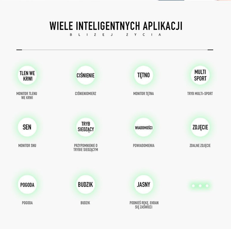 Funkcje: Energooszczędny Bluetooth Chip wersja 4.0, monitor tętna, ciśnieniomierz, krokomierz, inteligentny monitoring snu, tryby sportowe, pogoda, budzik, stoper, powiadomienia o wiadomościach z telefonu, przypomnienia i inne.