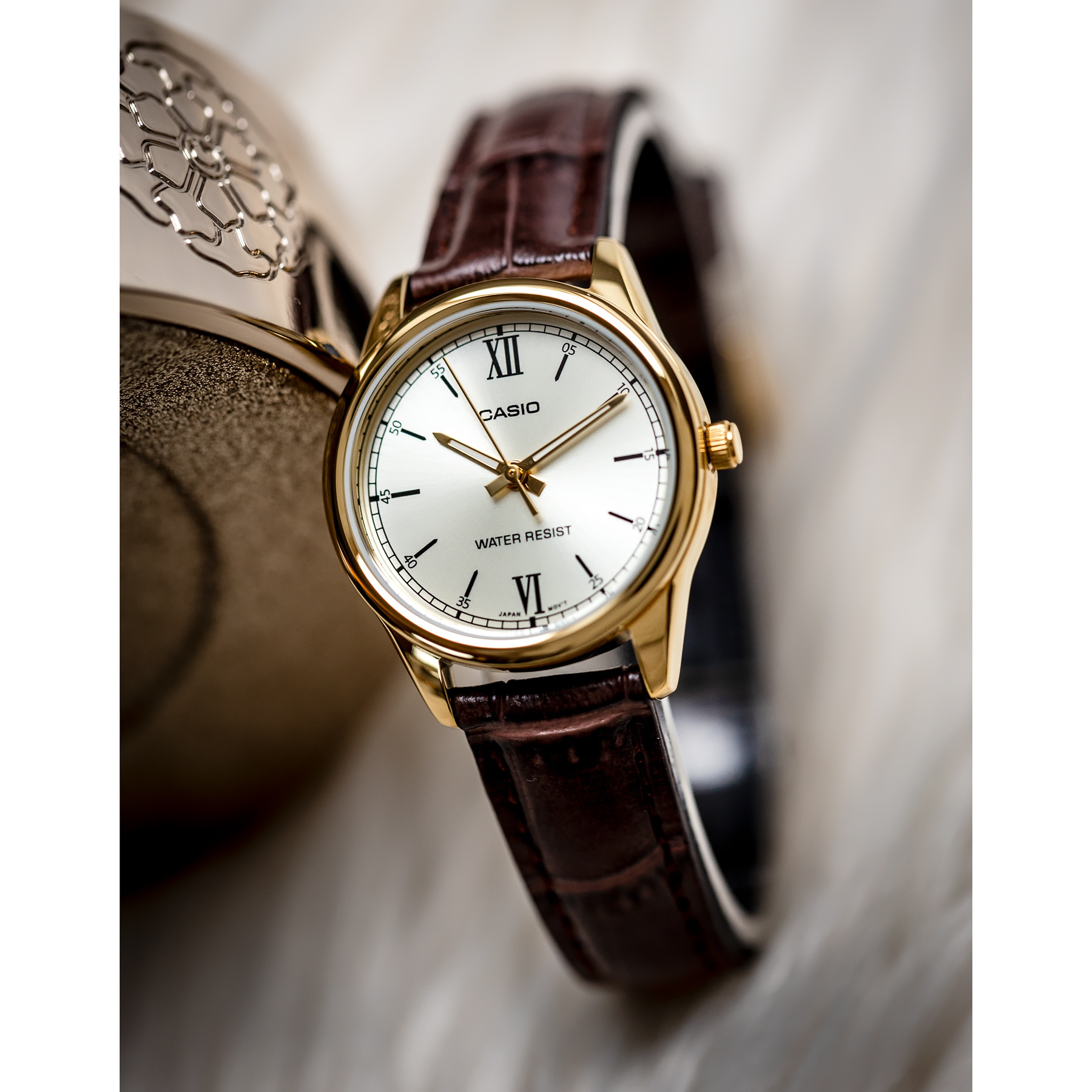 The CASIO LTP-V005GL-9BUDF watch is distinguished by the elegance of its round envelope and minimalist design. Its reliability is based on a precise Japanese quartz mechanism, valued in the watchmaking world for its excellent accuracy.