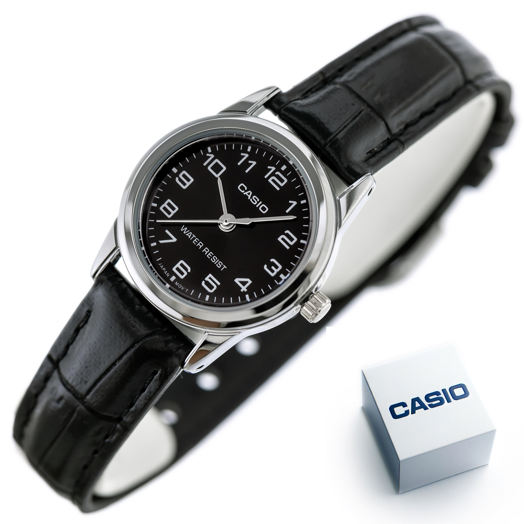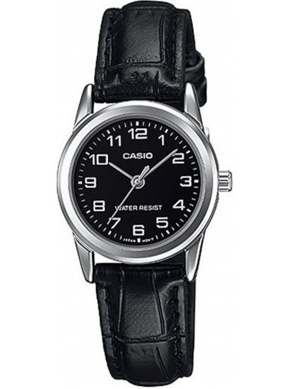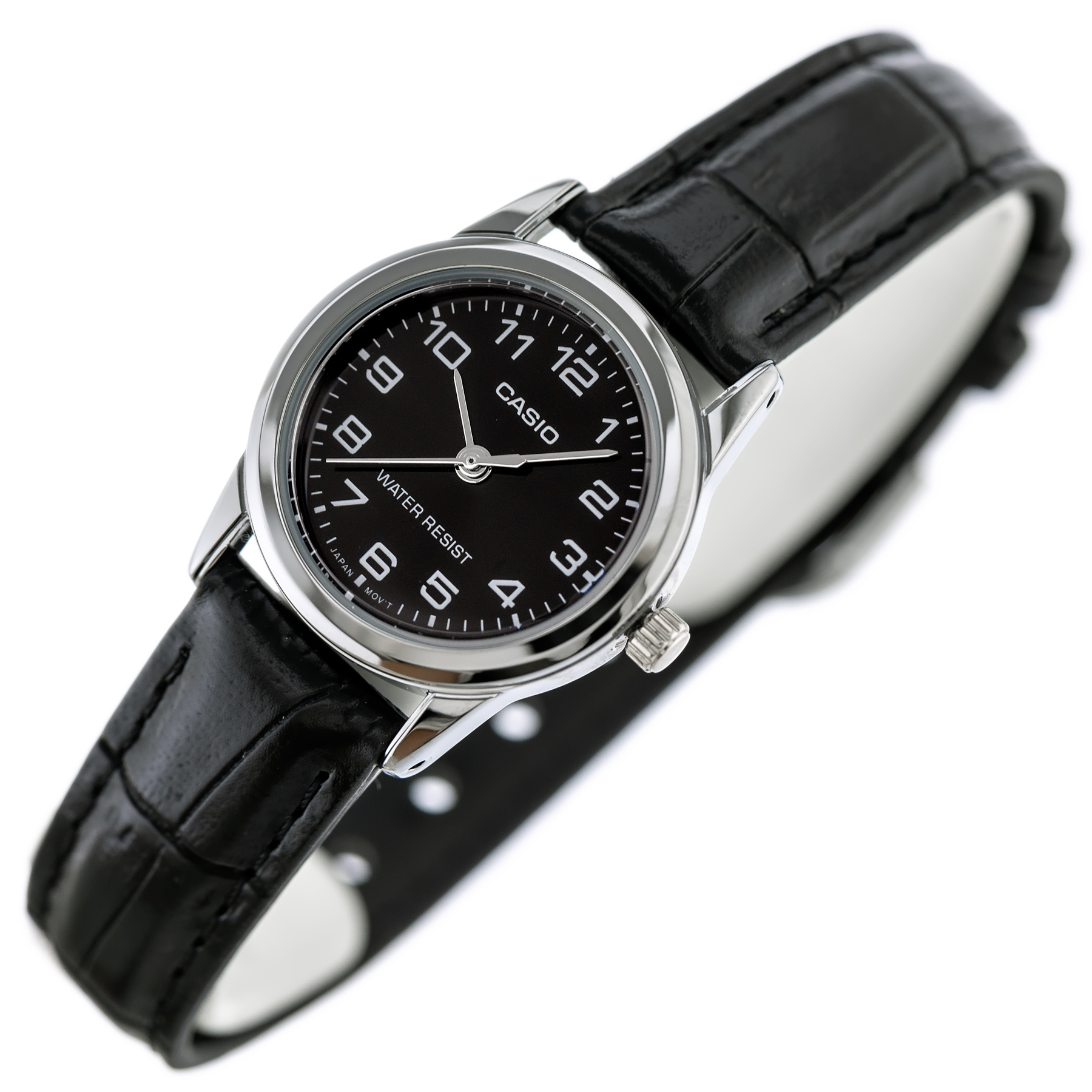 The leather strap in black is the perfect complement to the overall look, offering comfort for all-day wear. The Casio LTP-V001L-1B operates on a precise quartz movement, ensuring reliable timekeeping.