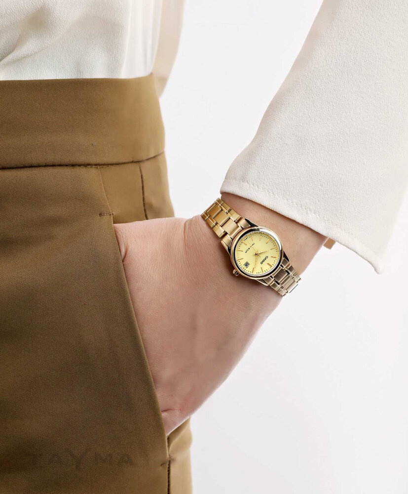 This model features an easy-to-read gold dial, which contrasts with the indexes and hands for convenient time reading. The watch has a date function, and its WR30 water resistance protects against accidental splashes, making it a practical choice for everyday use.