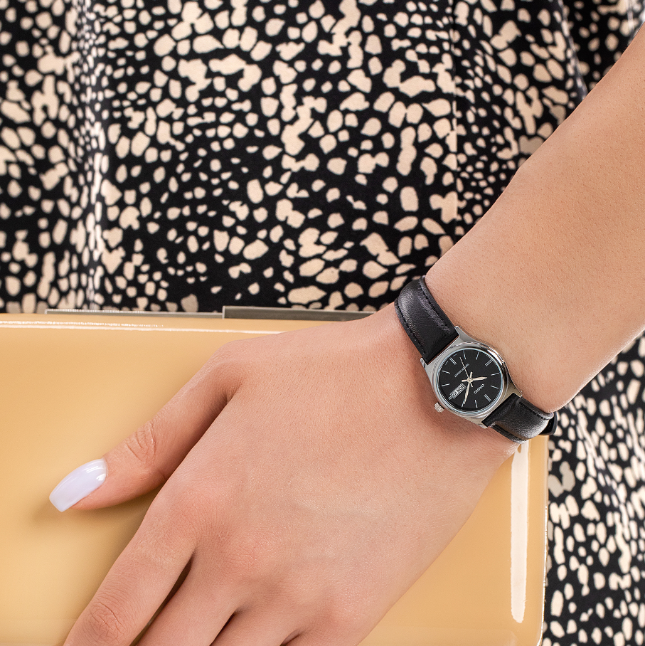 The Casio LTP-V006L-1B2 is a model that will work well in many situations. Its reliable quartz movement guarantees accuracy and long-lasting use without the need for frequent battery changes. The watch is lightweight and comfortable, and the leather strap adapts to the shape of the wrist, ensuring comfort throughout the day's wear. Thanks to its water resistance, the watch is resistant to minor splashes, making it a practical choice for everyday wear.