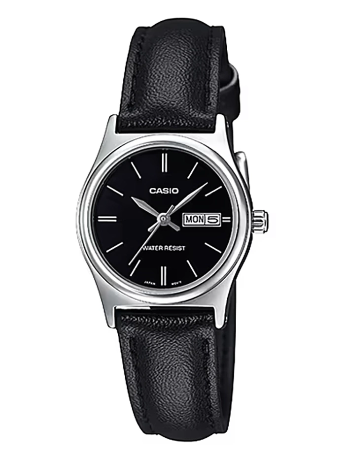 The Casio LTP-V006L-1B2 women's watch is an elegant accessory that combines classic design with modern functionality. Its subtle silver envelope and delicate leather strap form a harmonious duo that easily matches a variety of styles - from casual to more formal. The black dial with simple gold hands and clear indexes provides an elegant look, while making the watch highly legible, even in lower light.