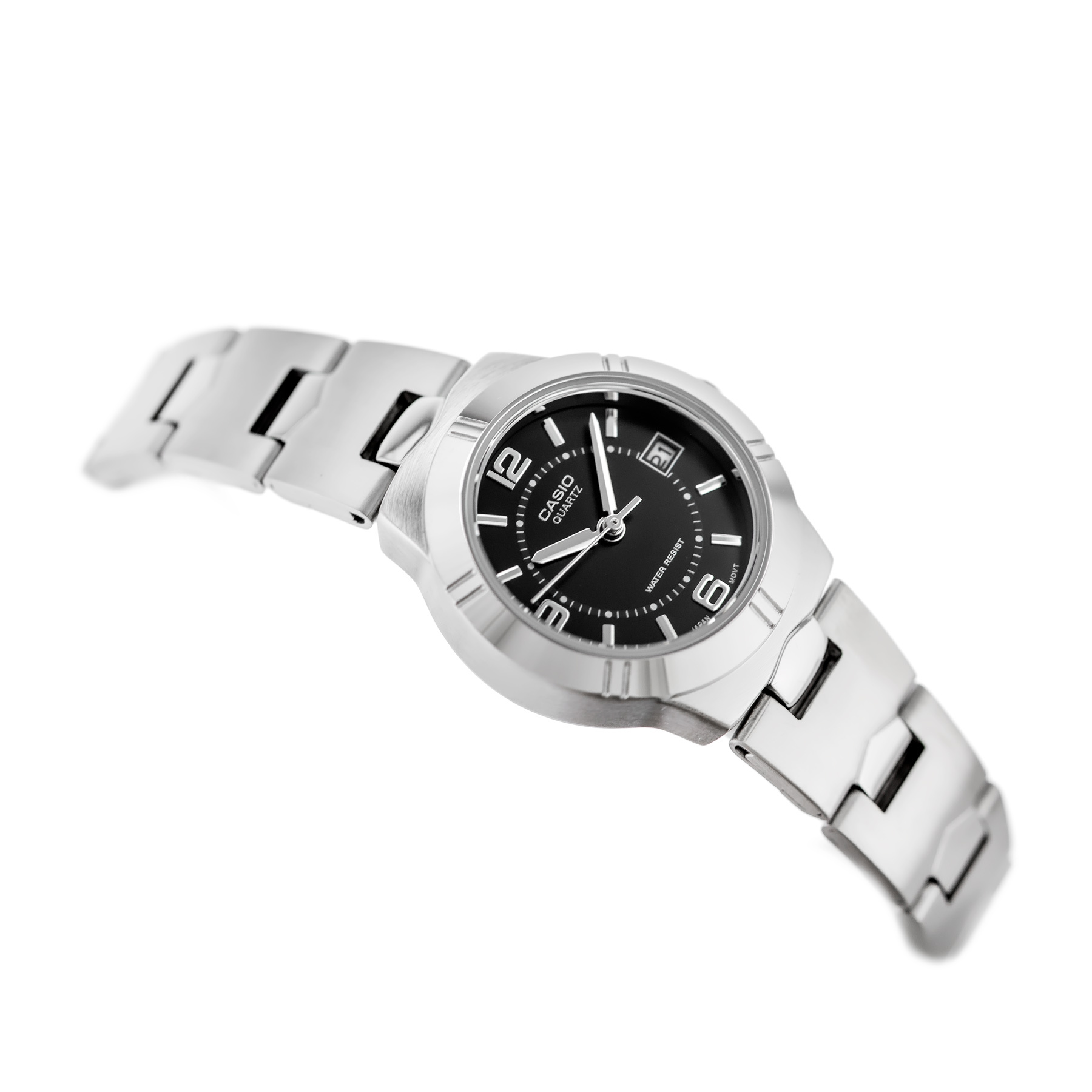 CASIO LTP-1241D-1A is an elegant women's watch that combines classic design with modern technological solutions. The watch features a steel envelope with a diameter of 25 mm, which gives it a subtle yet distinctive look. The envelope is made of high-quality stainless steel, which ensures durability and resistance to damage. The watch has a black dial, which features silver-colored indexes and hands, making the time reading convenient and clear. The dial also features a date pad, which displays the current day of the month. Thanks to the use of mineral glass, the dial is scratch-resistant, which ensures the long-lasting aesthetics of the watch. The bracelet, also made of stainless steel, has an elegant silver color that blends perfectly with the rest of the design. It is comfortable and easy to adjust to the wrist, making the watch comfortable for everyday wear. The CASIO LTP-1241D-1A is a watch that combines functionality with aesthetics, offering a precise quartz movement and an elegant design. It is an excellent choice for those looking for a watch that will match both everyday and more formal styles.